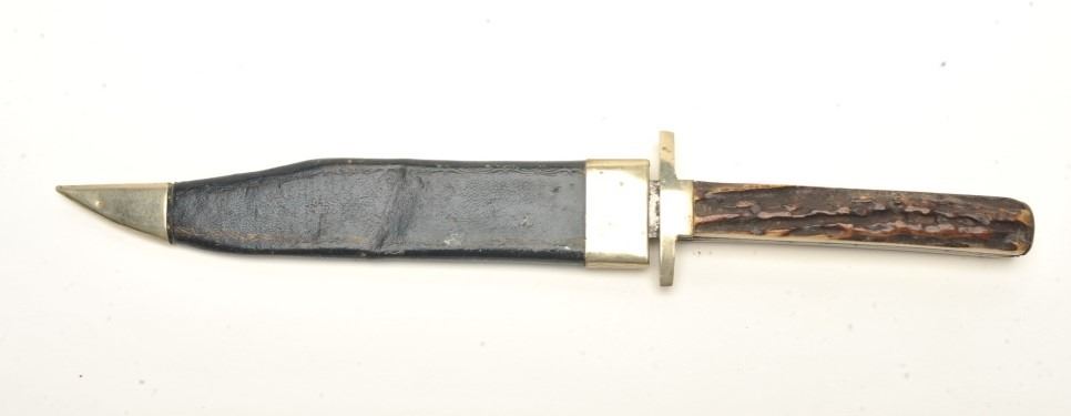 condition showing radical clip and German silver mounts stag grip. Measures 12 ¾” overall with 7 ¾” blade. Very good condition with full dimensions to the blade and most original polish with some minor pitting. Marked at ricasso with “Eye” and “Witness”. The original scabbard is also good to very good missing button for hanging. Est.: $800-$1600