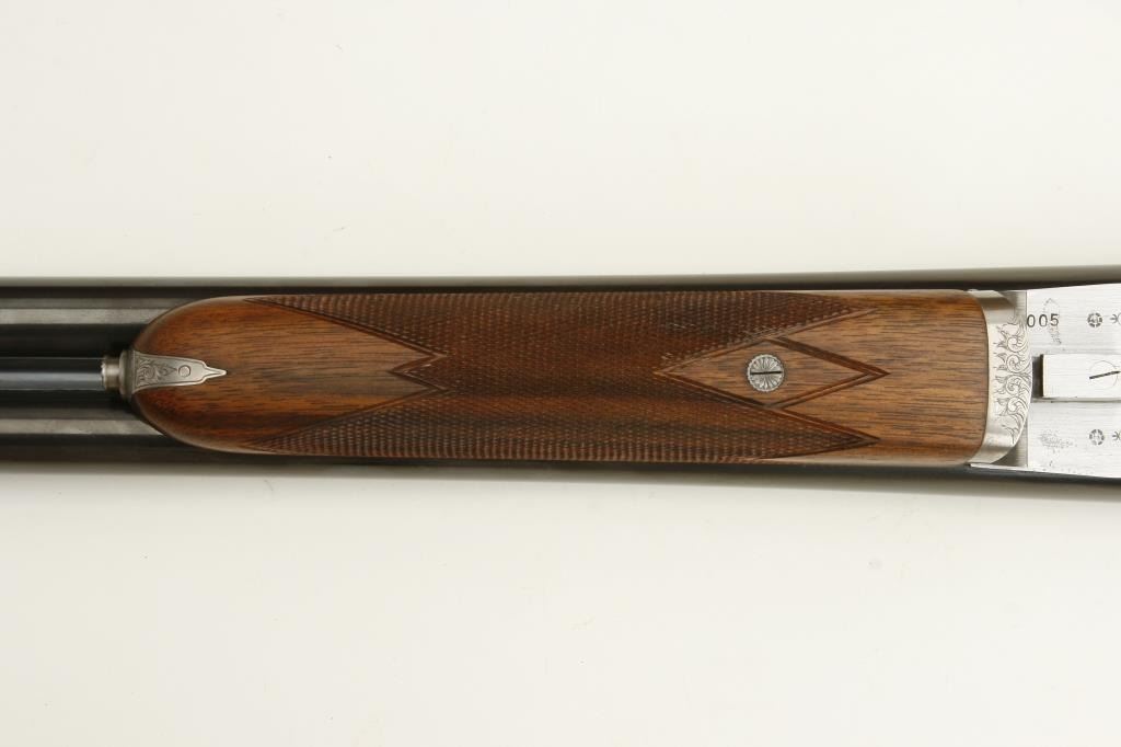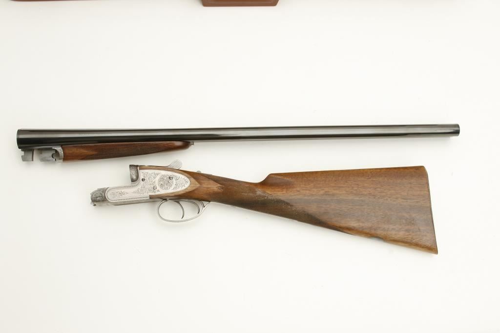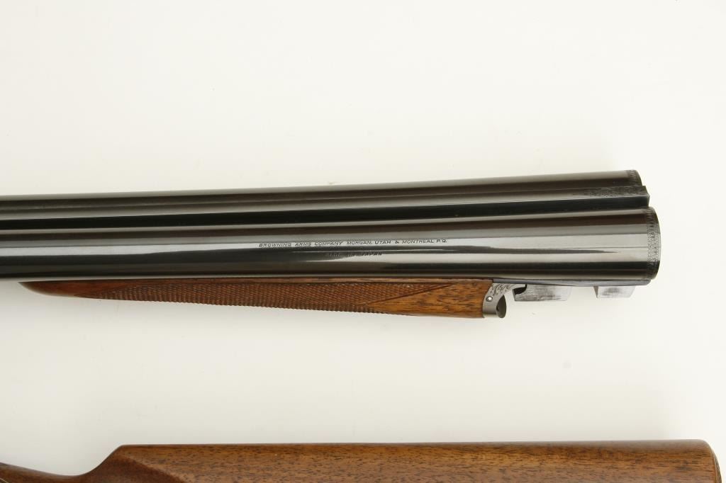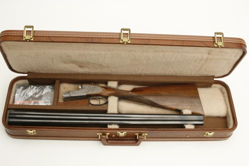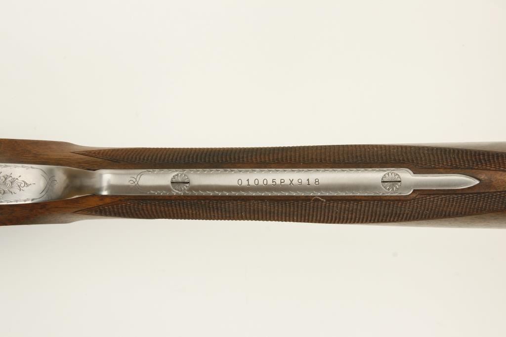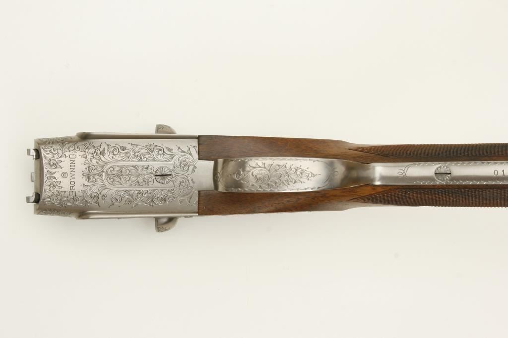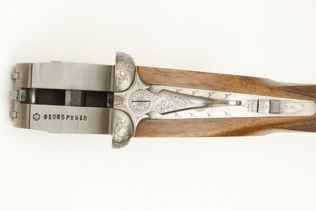 barrels, choked full and modified, double triggers, auto ejectors, S/N 01005PX918 showing classic English features including Manton and Churchill type rib, two Purdey biting lugs, scroll engraving on removable side plates engraved in rosette and scrolls. Coin finished action and receiver. In fine to excellent condition in Browning luggage case. Mentioned in “Shooting Sportsman”, Jan 2003. A very high grade and quality arm bound to increase in value. (Modern). Est.: $1500-$3000