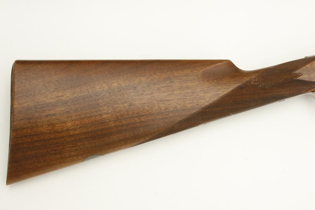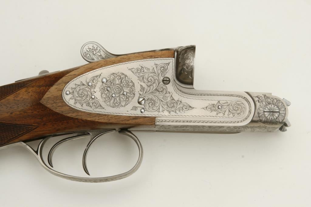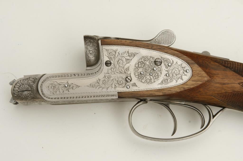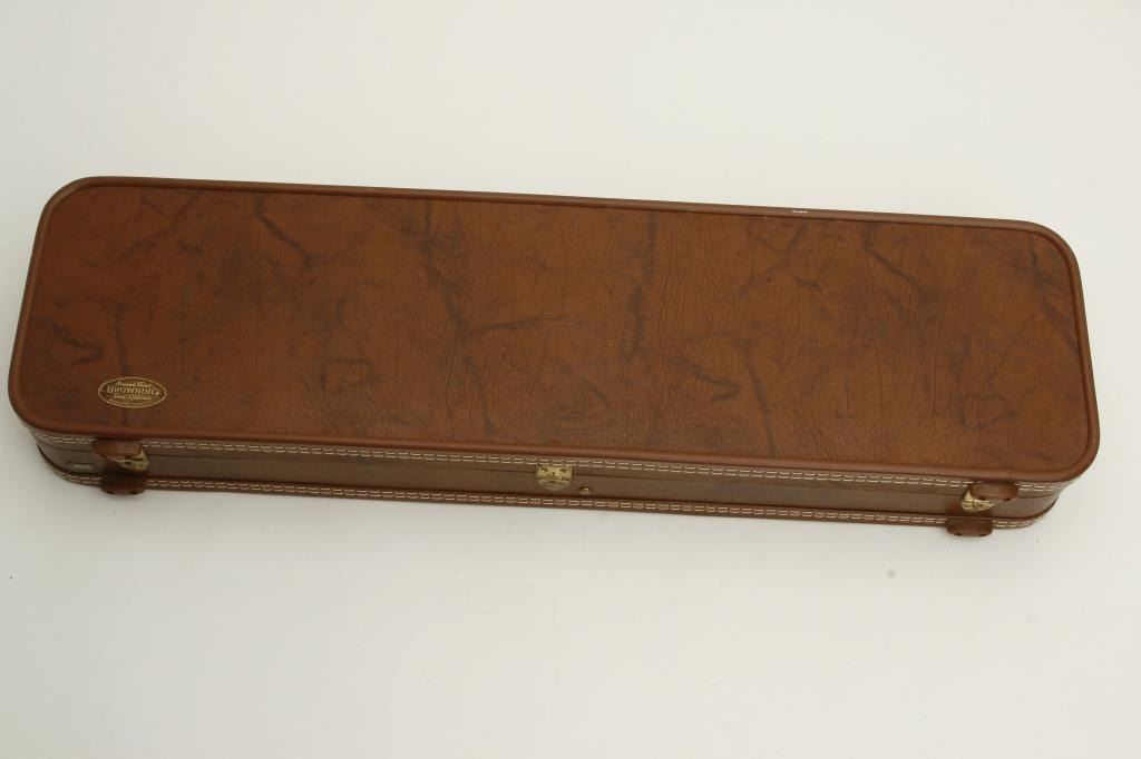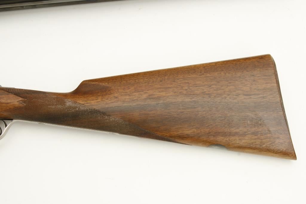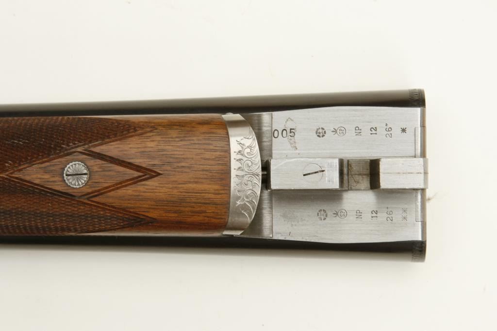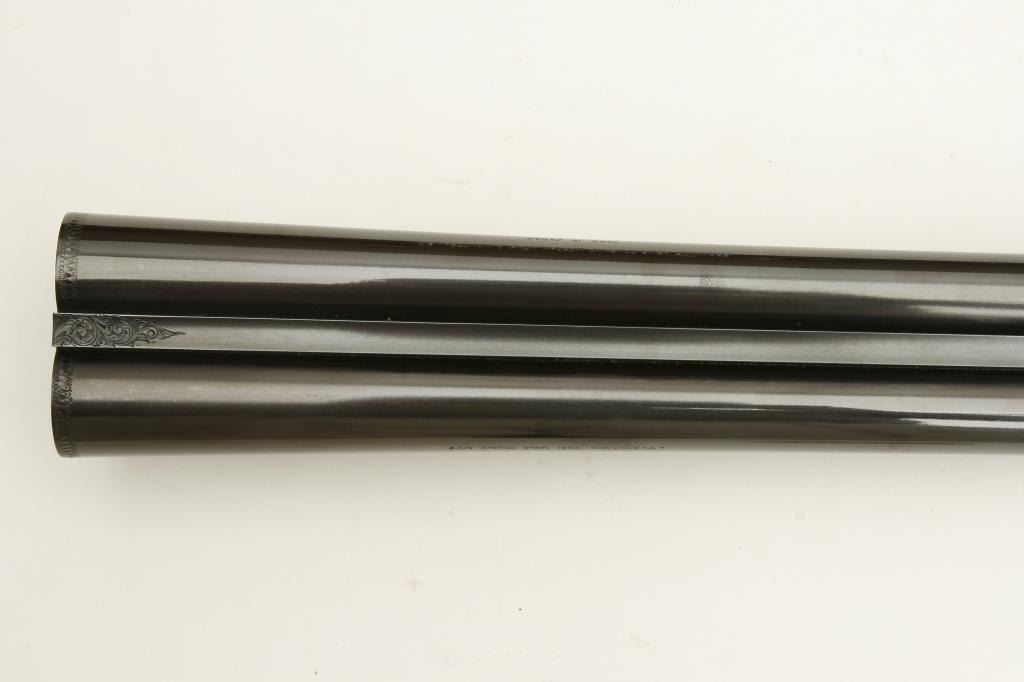 barrels, choked full and modified, double triggers, auto ejectors, S/N 01005PX918 showing classic English features including Manton and Churchill type rib, two Purdey biting lugs, scroll engraving on removable side plates engraved in rosette and scrolls. Coin finished action and receiver. In fine to excellent condition in Browning luggage case. Mentioned in “Shooting Sportsman”, Jan 2003. A very high grade and quality arm bound to increase in value. (Modern). Est.: $1500-$3000