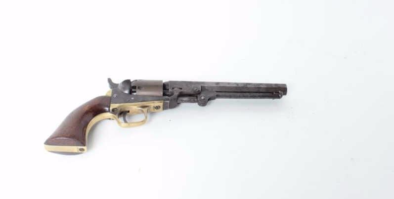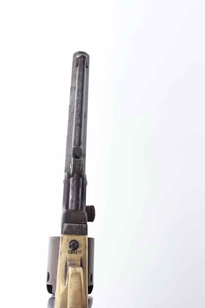 6” octagon barrel, brass straps, wood grips, S/N 224456, all matching including faint cylinder number; overall good condition with dark patina and some scattered spots of erosion, cylinder shows old cleaning and re-brown finish, action working and grips are good overall. (Antique). Est.: $600-$1,200.