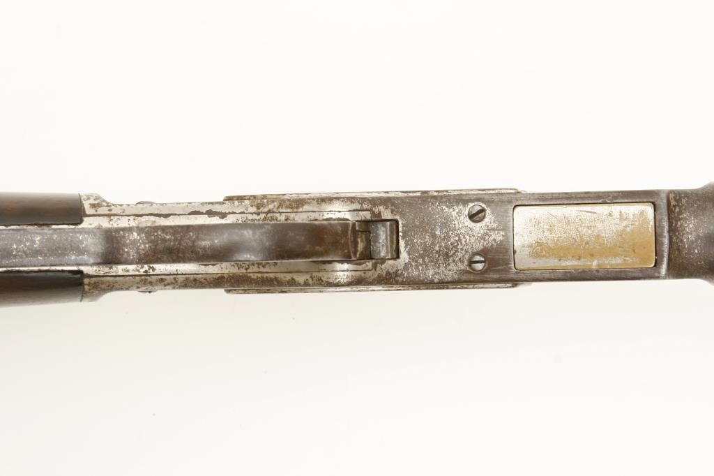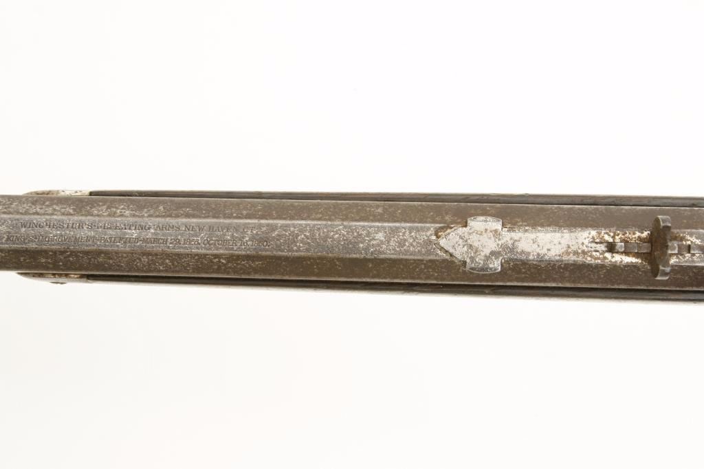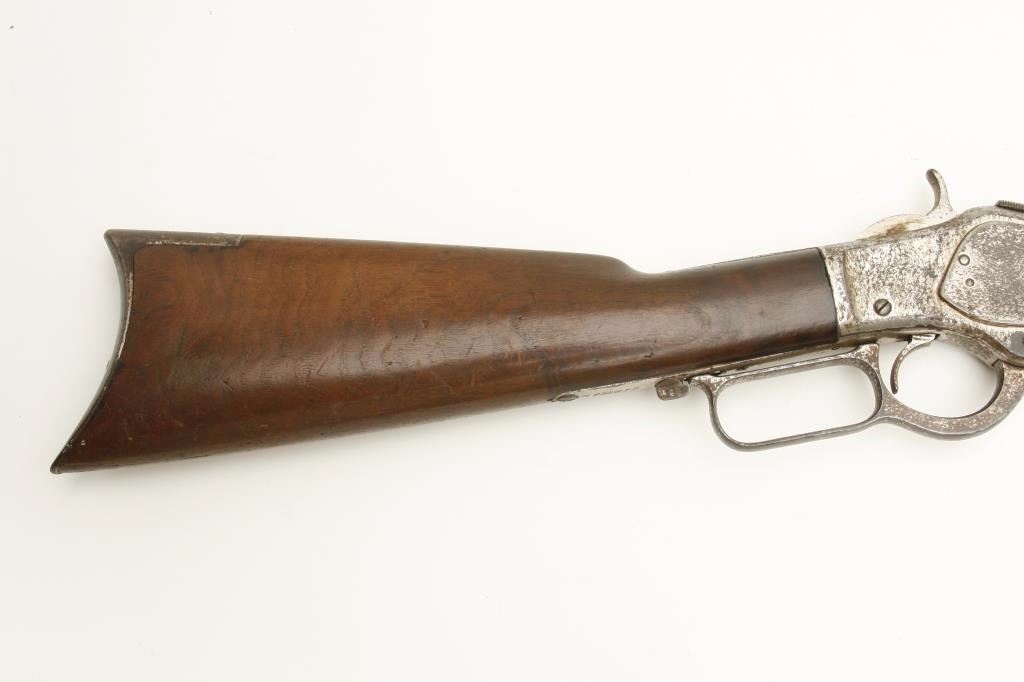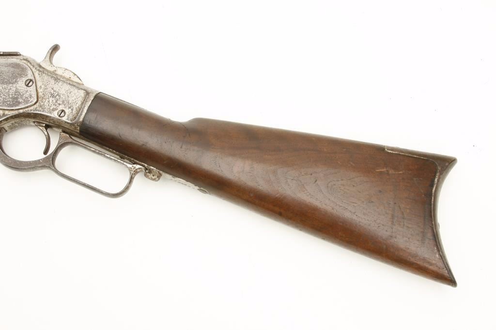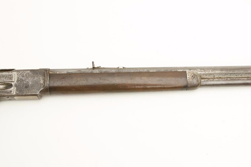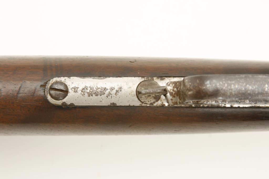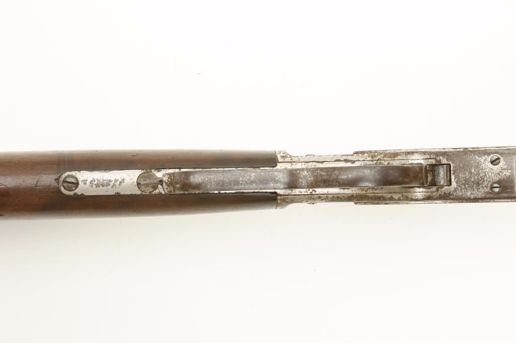 serial #127165A. The rifle is in good overall condition with a 24” octagon barrel with a knife blade front sight and standard rear. The barrel and full-length magazine show significant traces of their nickel finish with the remainder going to a brown patina. The receiver retains the majority of its flaking nickel finish with light surface erosion and surface rust noted and the dust cover intact. The smooth wood stocks are in good condition showing moderate wear with dents and compressions consistent with use. The butt stock ends with a smooth, metal crescent butt plate with trap. The bore is good with light pitting and erosion evident, the action is crisp and markings are legible. Although the rifle appears to have an old, quality re-nickel finish, a factory letter has been requested in order to determine the original finish of the rifle. (Antique) Est.: $750-$1,500.