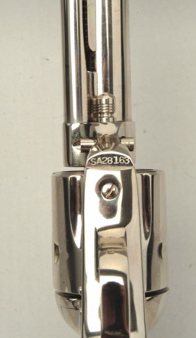 ¾” barrel, Nickel finish, wood grips, S/N SA28163. This revolver remains in very good plus condition showing nearly all its original bright nickel finish remaining except on the front strap which has become frosty. The cylinder shows a light index ring. The action is crisp and the bore is very good. (Modern/PPT) Est.: $800-$1600