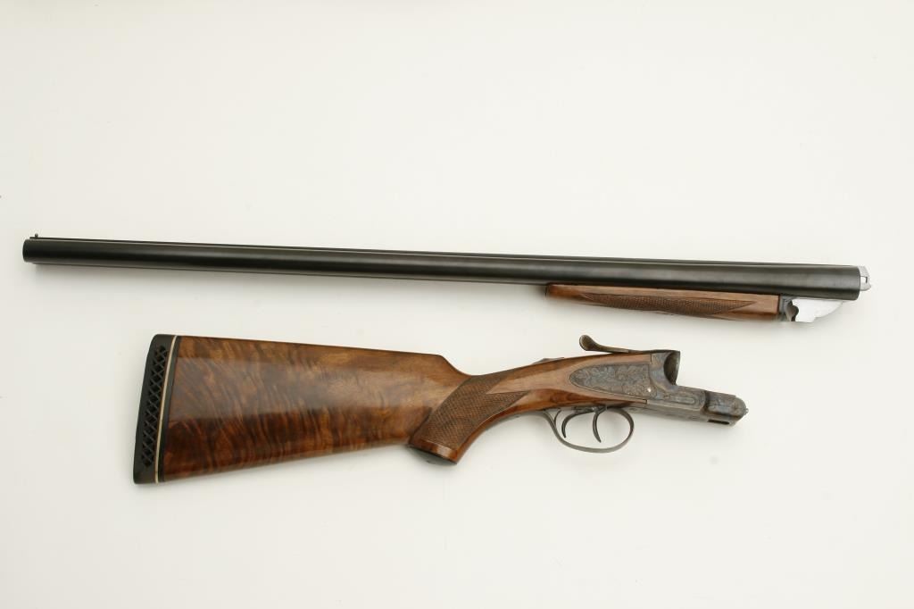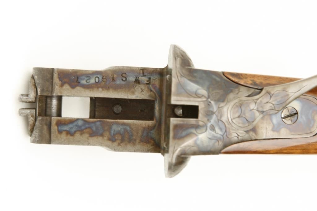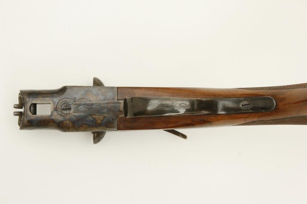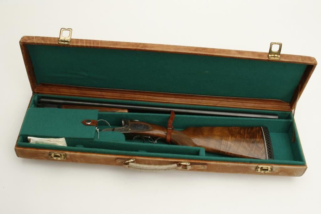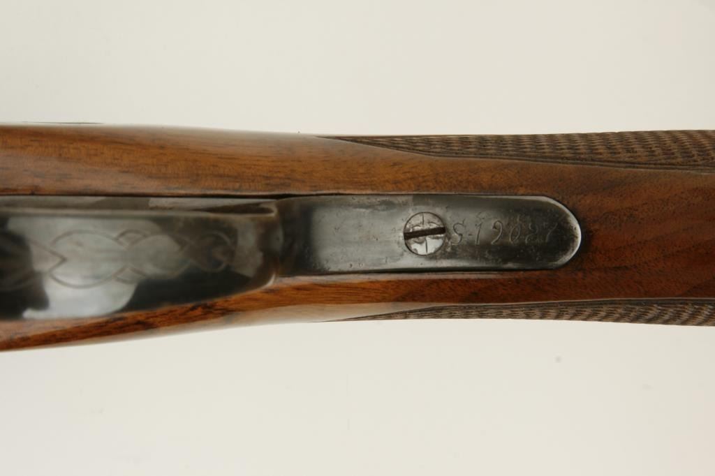 grained stock, double triggers, standard extractors, solid rib, S/N 19027 circa 1915. This shotgun shows a quality restoration of which 90%-95% remains. 14 5/8” pull with a 1 ¼” drop at the comb and 1 ½” at the heel. Luggage case is included. (C&R) Est.: $900-$1800