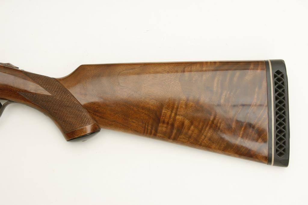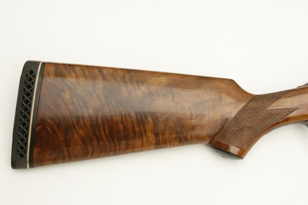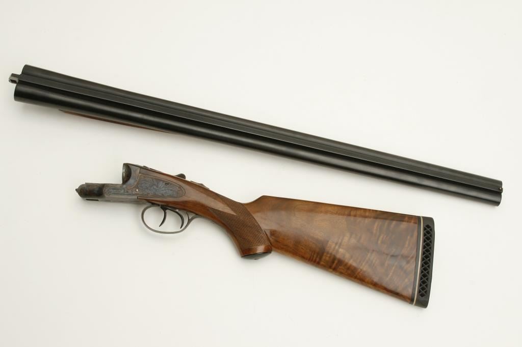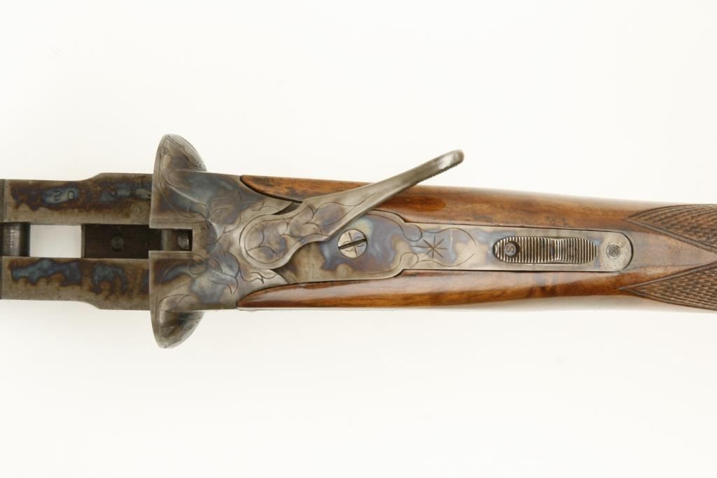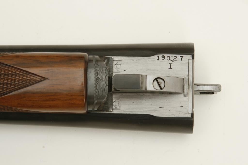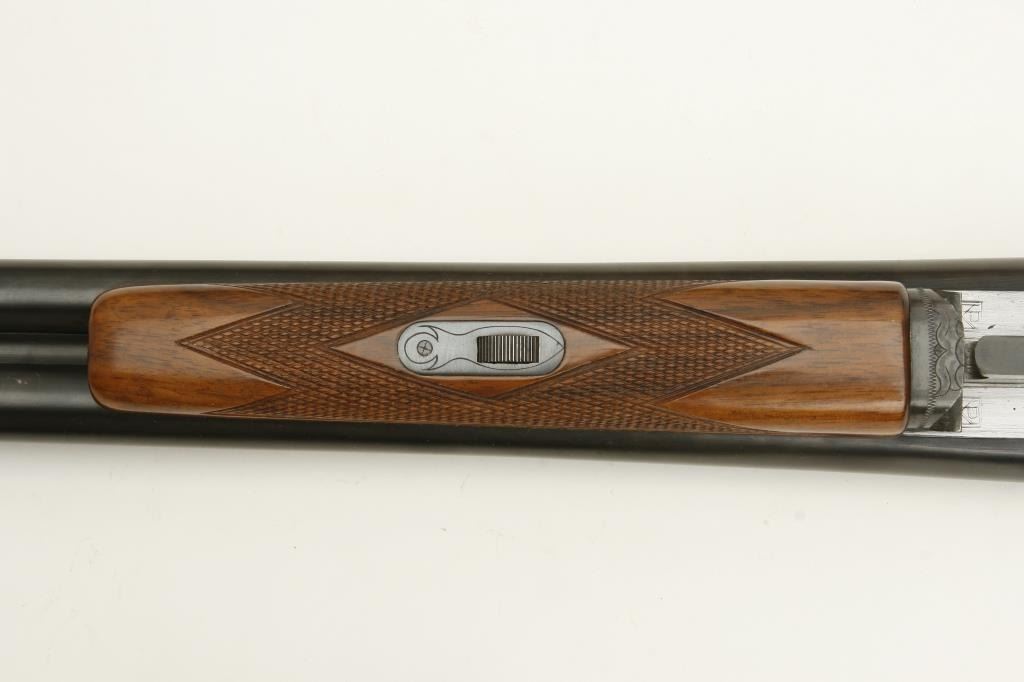 grained stock, double triggers, standard extractors, solid rib, S/N 19027 circa 1915. This shotgun shows a quality restoration of which 90%-95% remains. 14 5/8” pull with a 1 ¼” drop at the comb and 1 ½” at the heel. Luggage case is included. (C&R) Est.: $900-$1800