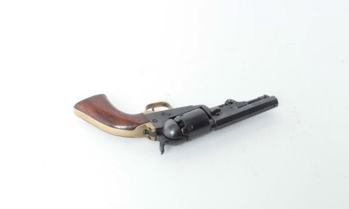 4” octagon barrel, re-blued finish, altered rammer, S/N 69966 (all matching visible numbers), in overall good condition as re-finished; good markings and grips, working action; interesting two tapped screws in rear bow of trigger guard. (Antique). Est.: $500-$1,000.