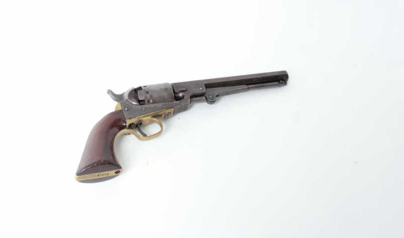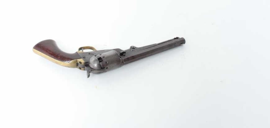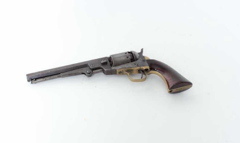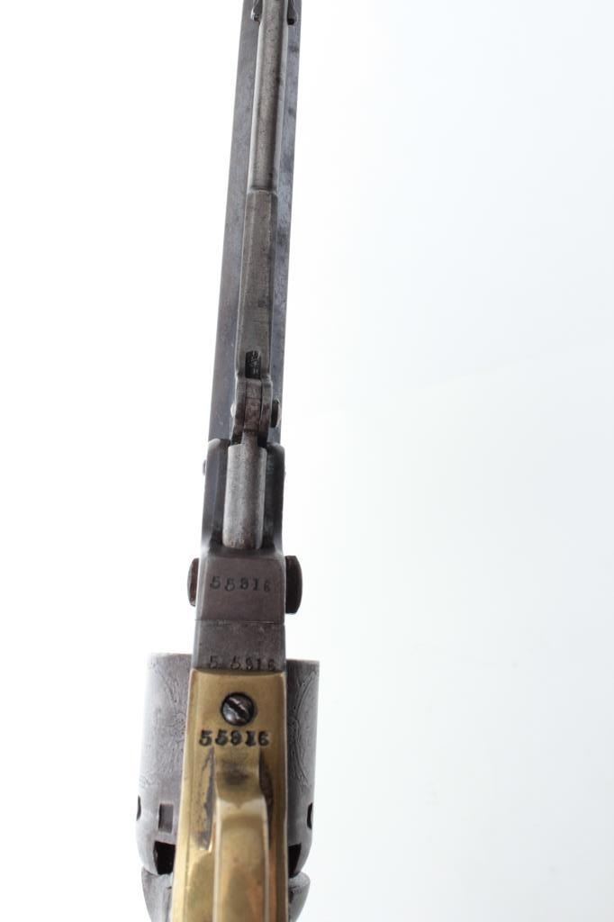 blued and case hardened finish, wood grips, S/N 55916, overall very good condition with dark patina and traces of original blue with hints of original case colors on the rammer; crisp action, sharp markings, majority of original cylinder scene remaining, good grips. (Antique). Est.: $600-$1,200.