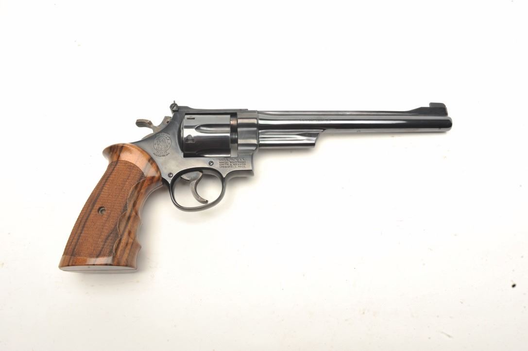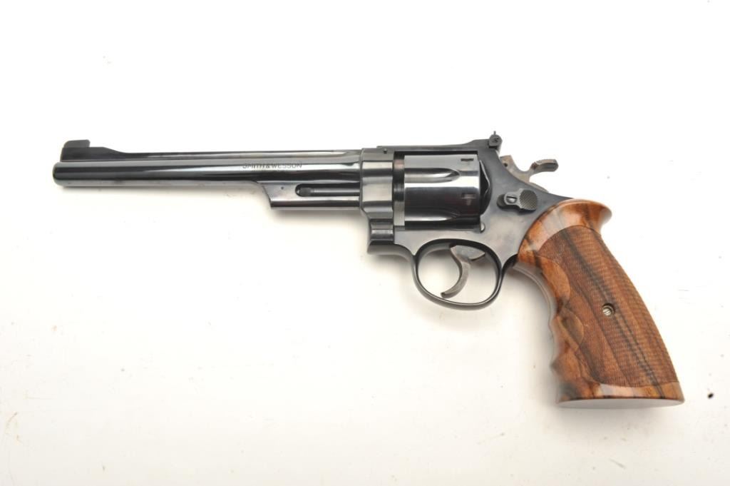 Magnum caliber, 8.375” barrel, blued finish, S/N N832545; custom handmade checkered wood grips by Fred Shaw, recognized as O.C.’s best custom stock maker; overall excellent condition showing little if any use. (Modern/PPT). Est.: $750-$1,500.