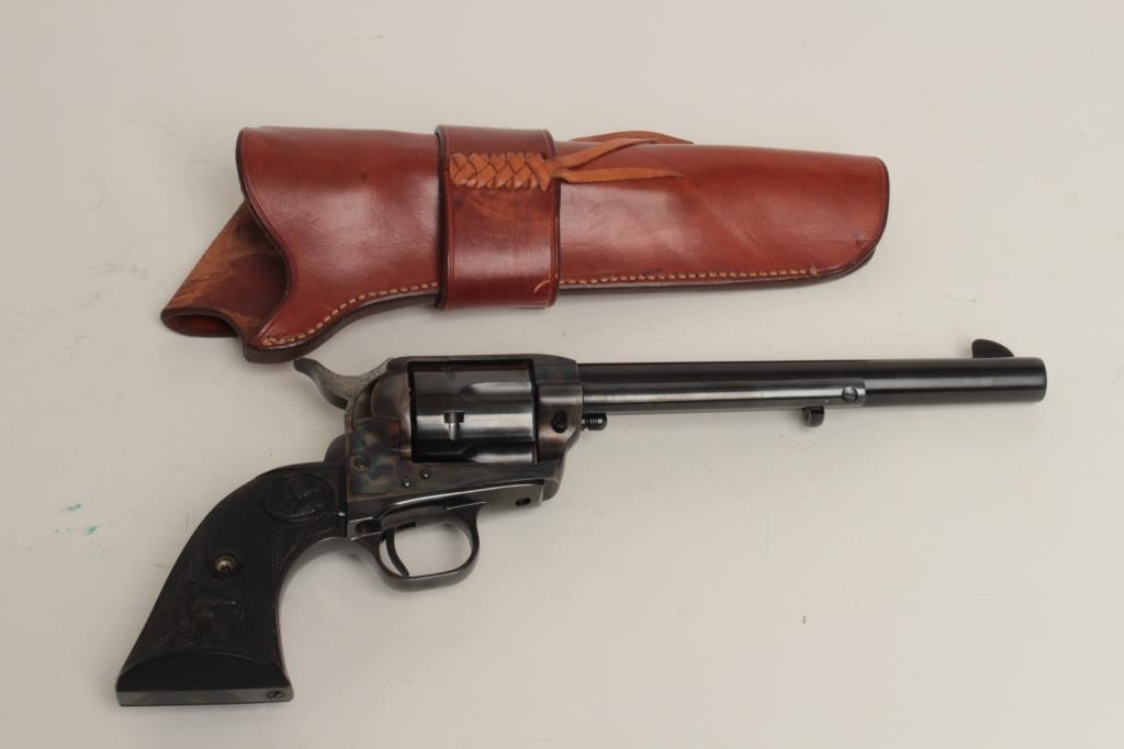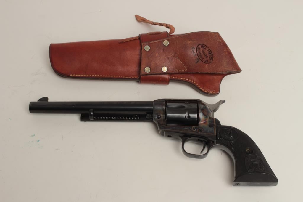 7.5” barrel, blued and case hardened finish, checkered eagle plastic grips, S/N SA11058, in overall excellent condition with very slight muzzle wear; accompanied by a single loop holster by Bill French of Burbank, CA. (Modern/PPT). Est.: $800-$1,600.