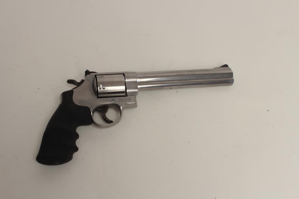 Magnum caliber, 7.5” barrel, stainless steel, non-fluted cylinder, stippled finger groove hard rubber grips, S/N CFS3528, in overall excellent condition accompanied by a factory blue hard carry case and owner’s manual. (Modern/PPT). Est.: $750-$1,500.