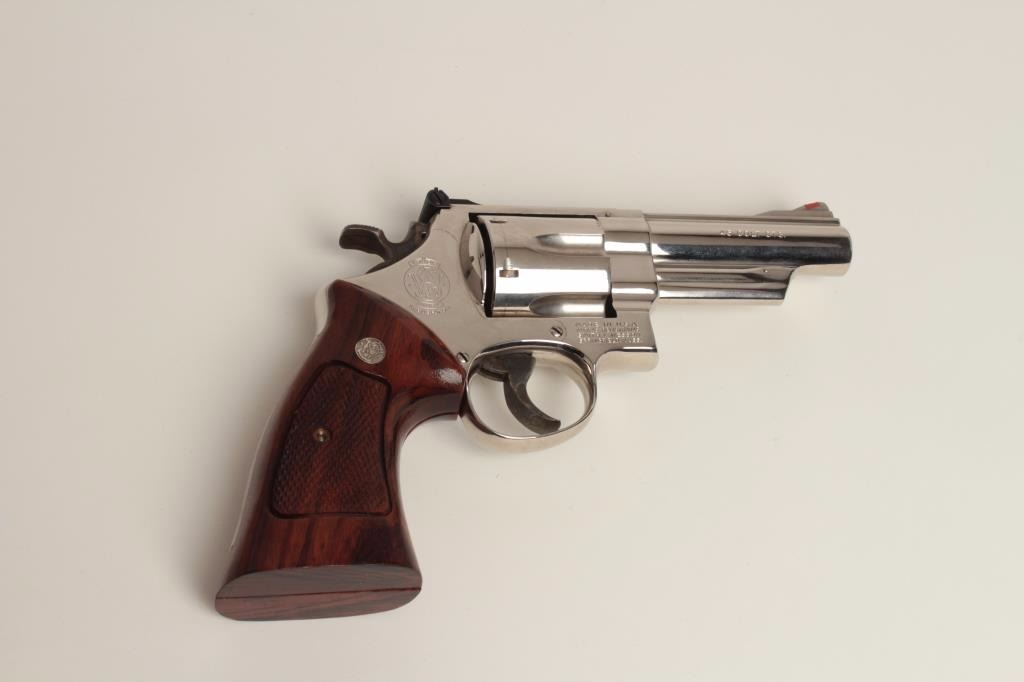 Colt caliber, 4” barrel, scarce factory nickel finish, checkered wood medallion combat grips, S/N N822188, in overall fine condition showing approximately 99%+ original finish, fine bore, action, markings and grips. (Modern/PPT). Est.: $700-$1,400.