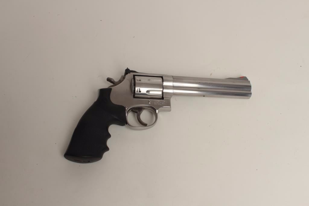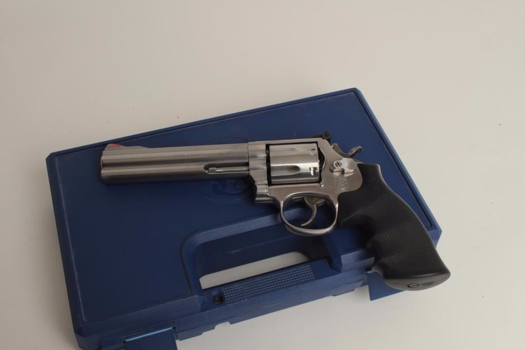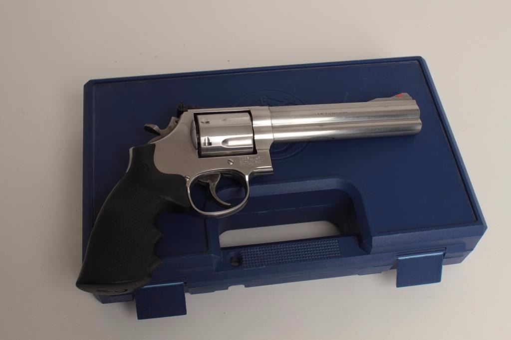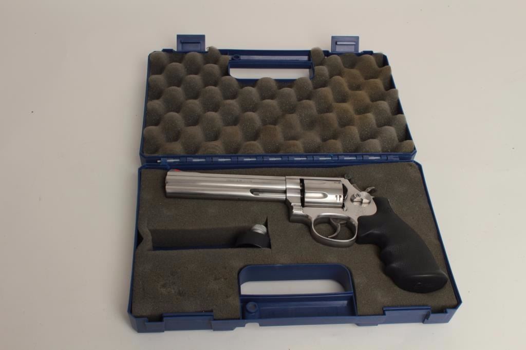 caliber, 6” barrel, stainless steel, factory finger groove hard rubber grips, S/N CAJ2969, in overall fine condition with a fine bore, crisp action, markings and grips; accompanied by a factory blue padded hard carry case and one speed loader. (Modern/PPT). Est.: $500-$1,000.
