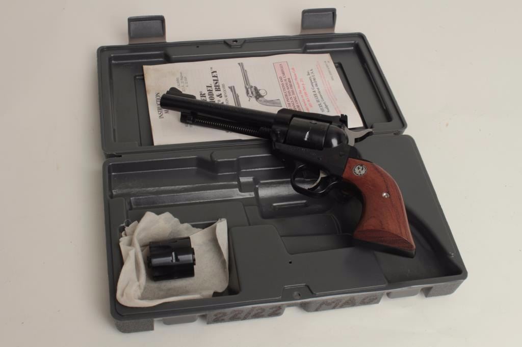 with extra .22 Mag. caliber cylinder; 5.5” barrel, blued finish, wood medallion grips, S/N 263-86603, excellent condition showing minor handling; with instructions and factory grey hard case. (Modern/PPT). Est.: $250-$500.