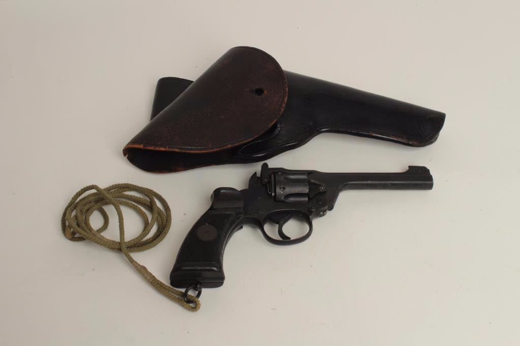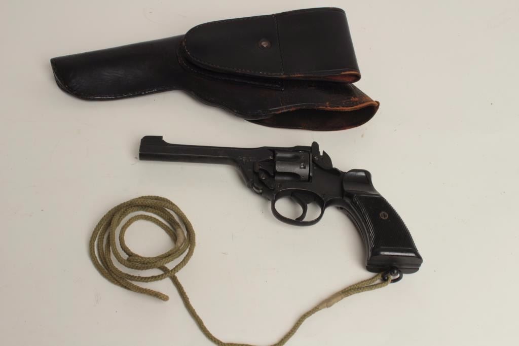 barrel, military finish, checkered black plastic grips with lanyard ring and cord, S/N Z5755, in overall very good + condition showing the majority of its military finish, crisp action, very good to near fine bore and very good markings and proofs. Accompanied by a black leather flap holster. (C&R/PPT). Est.: $250-$500.