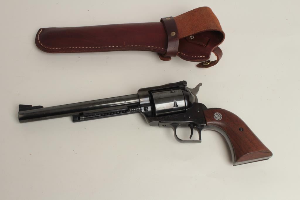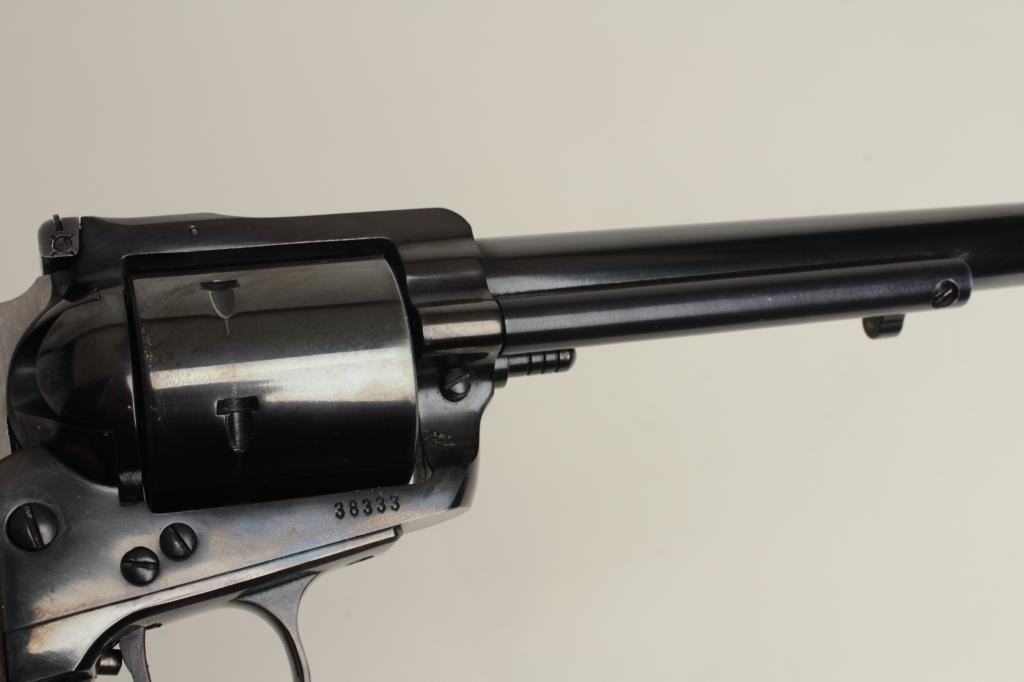 caliber, 7.5” barrel, blued finish, wood medallion grips, transfer bar retro-fitted; S/N 38333, in overall fine to excellent condition displaying approximately 97% original blue with some muzzle and high point wear, fine bore, crisp action and sharp markings; left grip’s lower rear toe shows a wear area. Accompanied by a brown leather holster. (C&R/PPT). Est.: $300-$600.