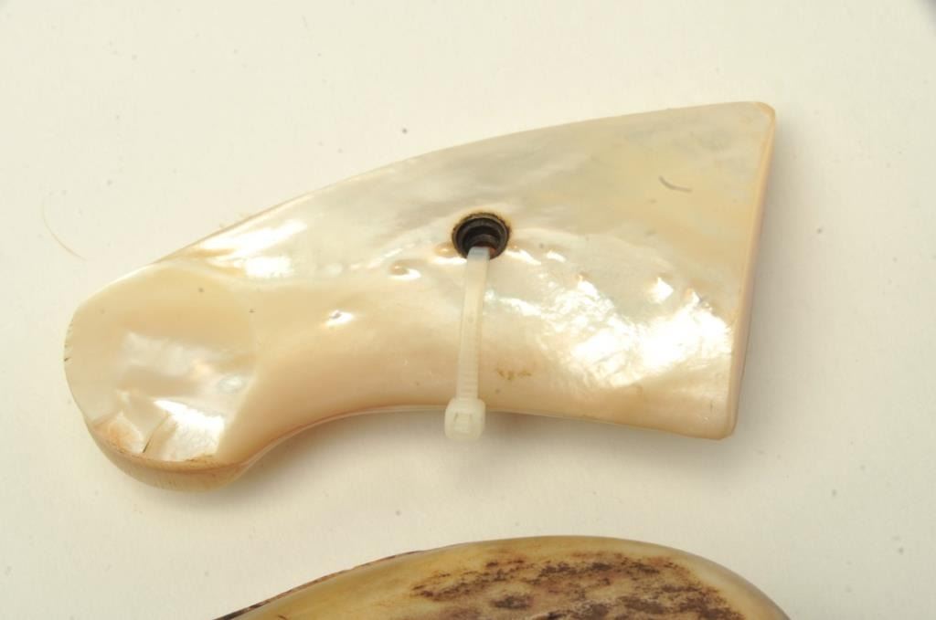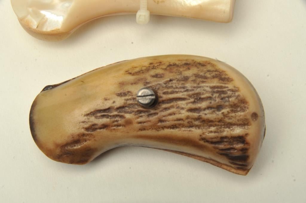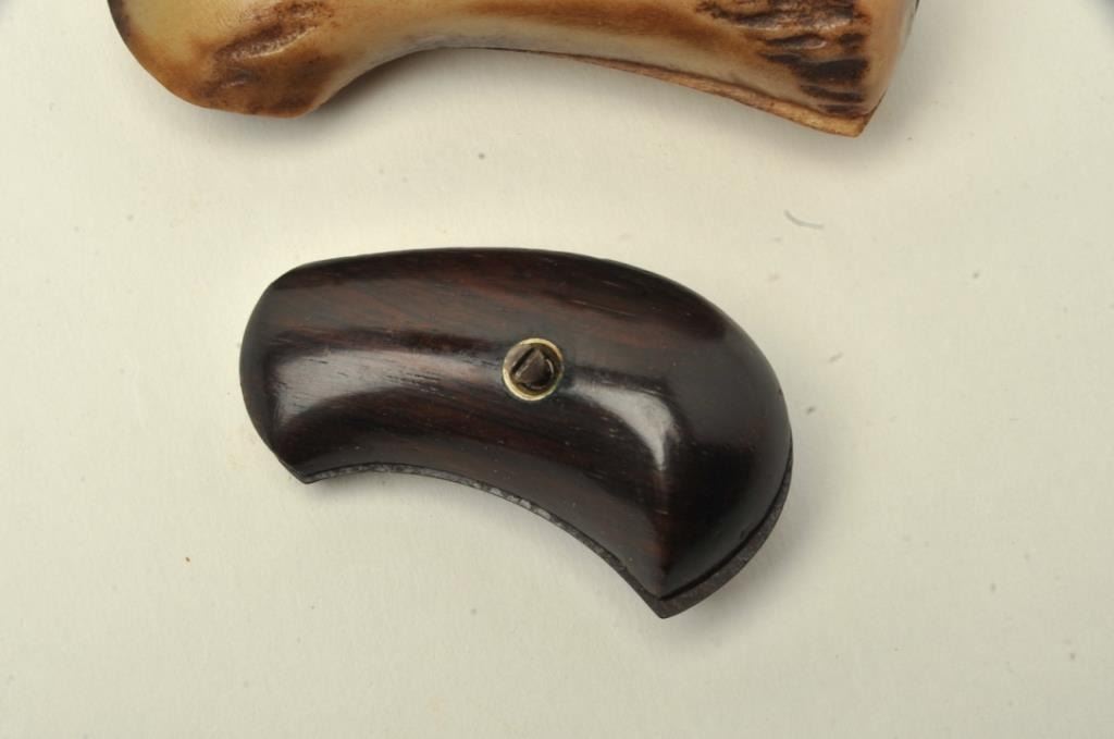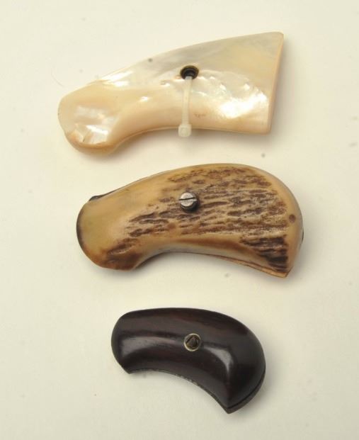 appears to be a Colt Model 1878 DA revolver, pearls for a Colt medium frame DA revolver and rosewood grips for a Smith & Wesson .32RF spur trigger revolver; all good to very good condition overall. Est.: $200-$275.