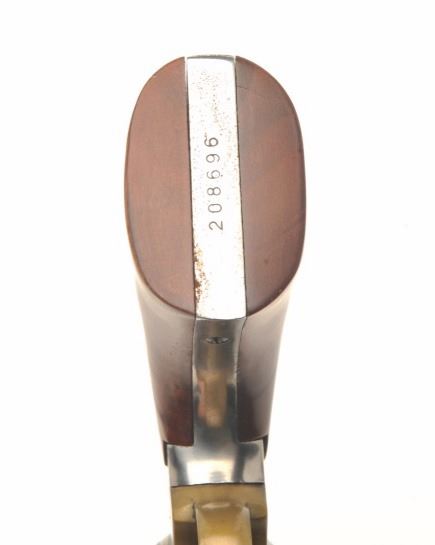 1858 percussion revolver, .44 caliber, blued and stainless, wood grips, S/N 208696, in near new condition with brown leather holster. (Percussion). Est.: $175-$350.