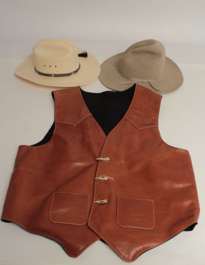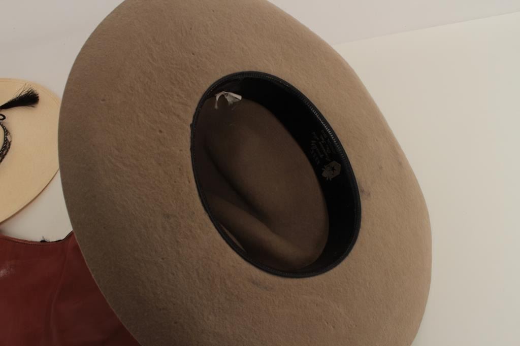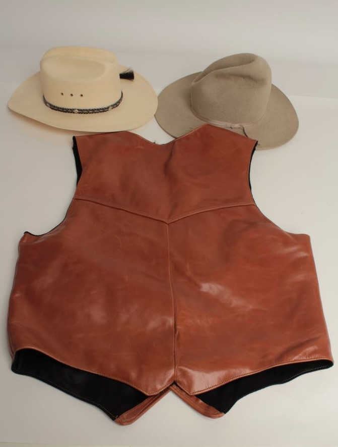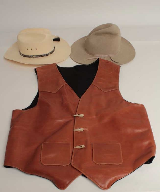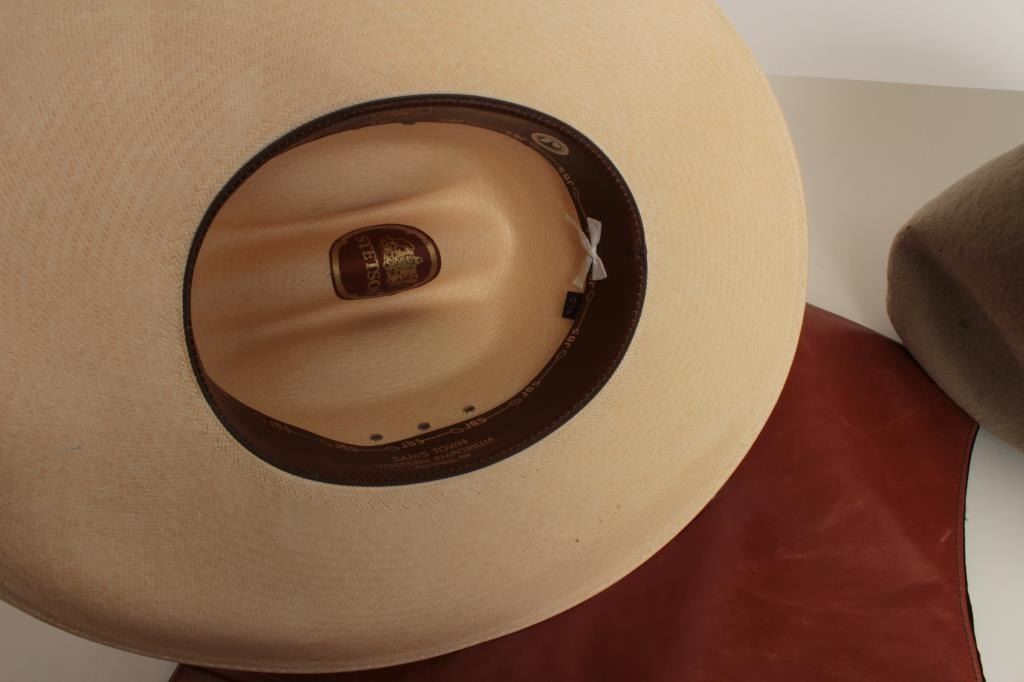 with horn buttons, a Montana Peak style XXXX cowboy hat and a Stetson XXXXXXXX woven straw hat with woven horsehair band. Est.: $100-$200.