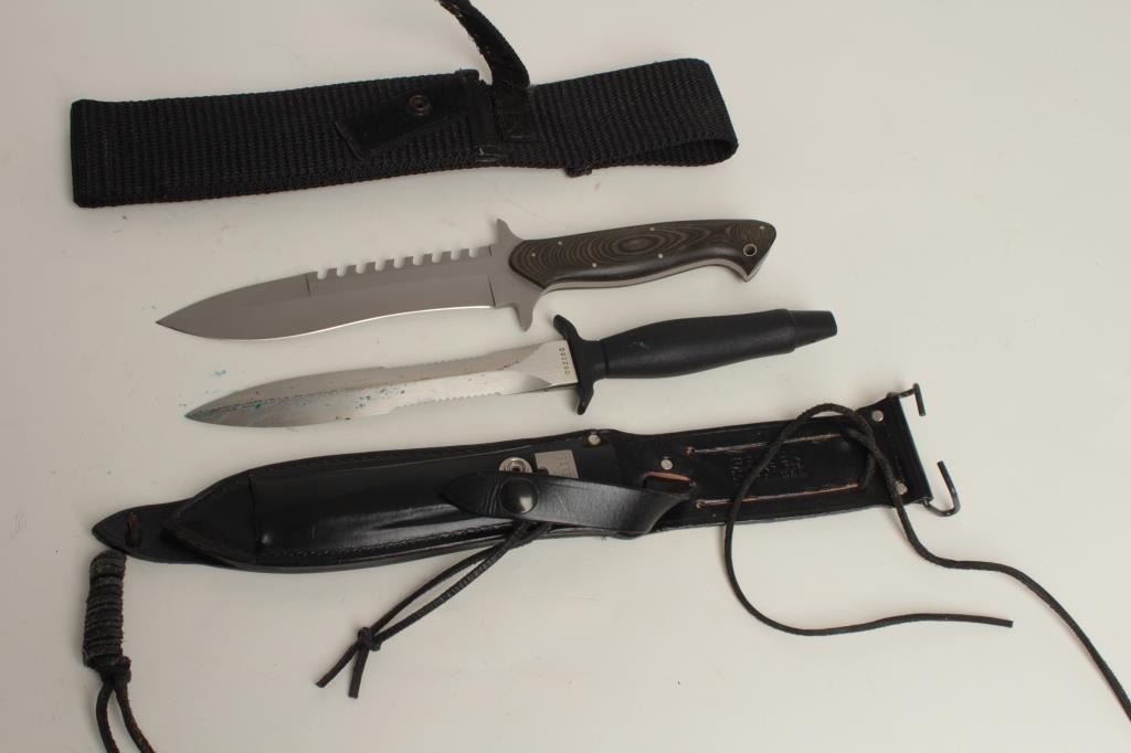 Cutlery (Japan) with woven sheath in fine condition; the other is a Gerber with leather sheath and sharpening stone in very good to fine condition. Est.: $150-$300.