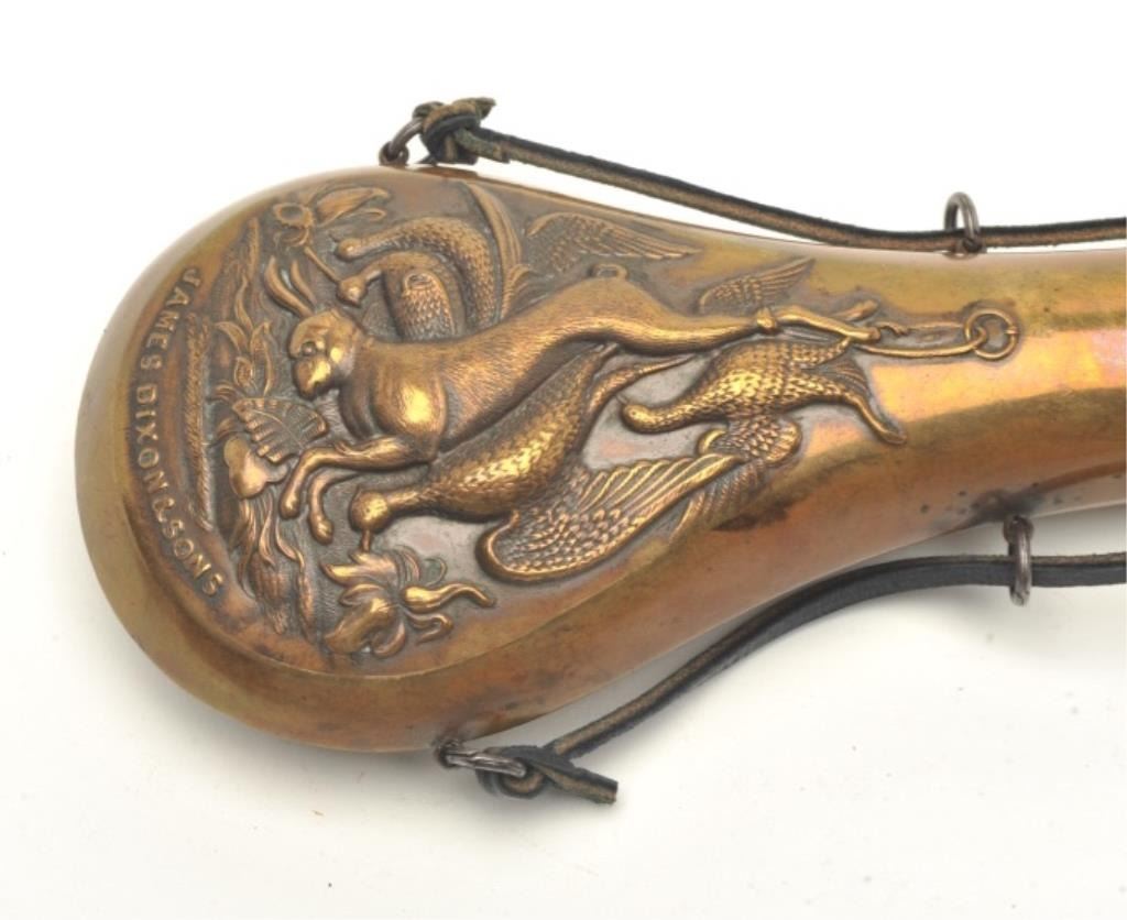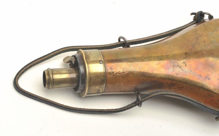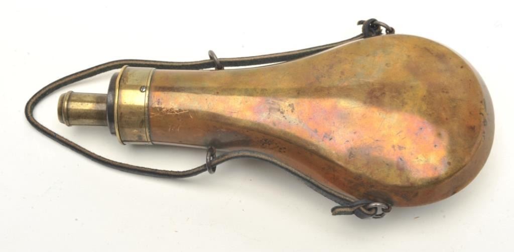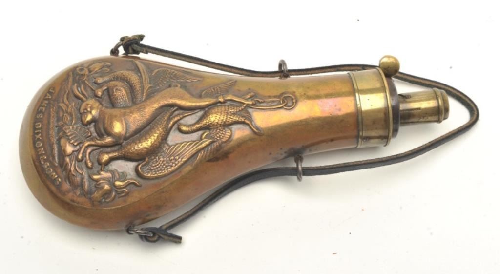 name on front and high relief body. Mid-19th century for large bore shotgun. Measures 8” from spout to the end with good spring. 30% lacquer remains and good seams with nice patina. Est.: $150-$300