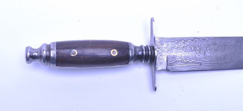 point Damascus blade stamped “Baker”. Spanish style hilt with wood pinned grips. Measures 13 1/8” overall. Has a great early 19th century look. In very good condition with some minor sharpening to the edge. Est.: $250-$500
