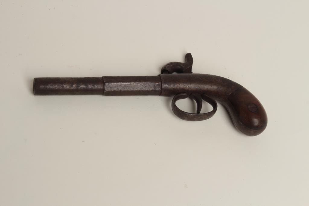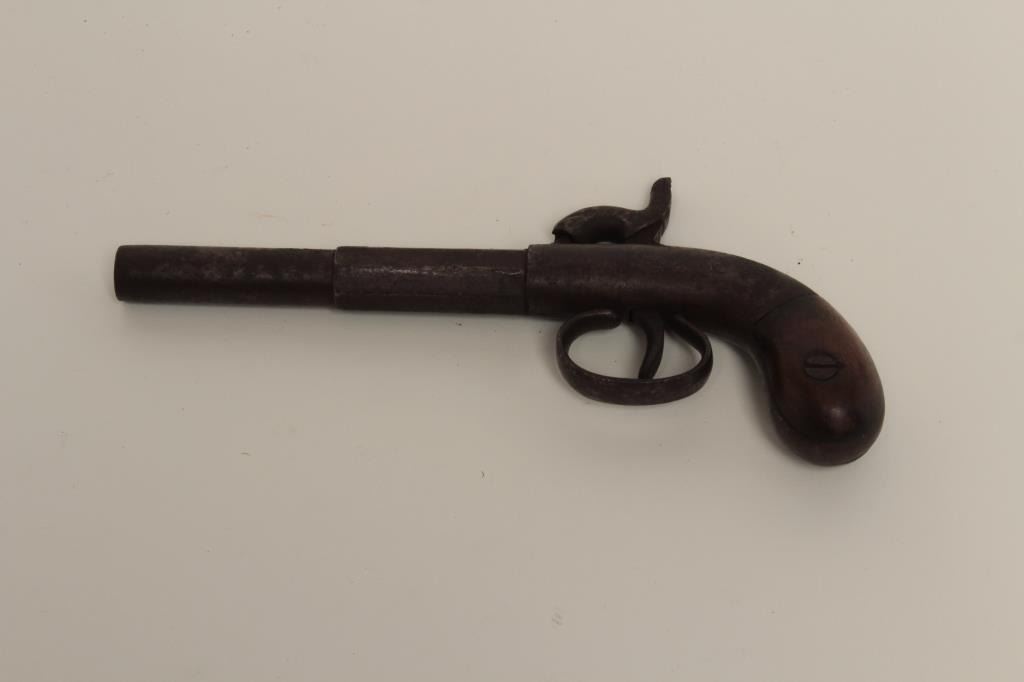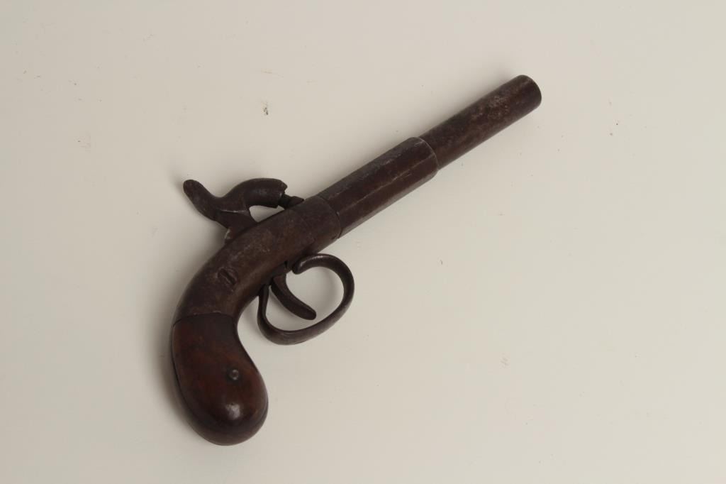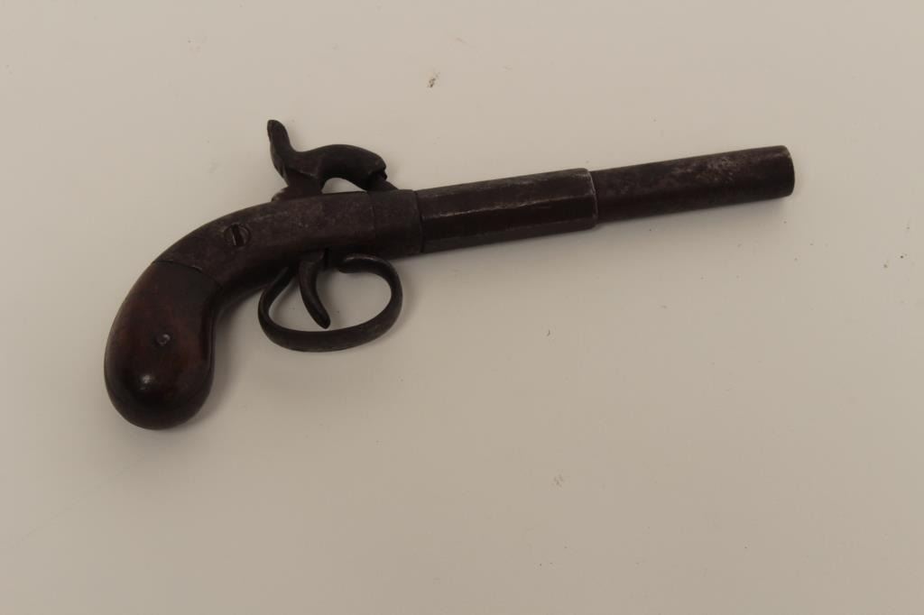 England style circa 1830s-1850s. Measures 7 ½” overall with a 4 1/8” barrel. Approximately .36 caliber, S/N 41 stamped on the frame. In fair to good condition. Type carried west as boot or pocket gun in gold rush era. (Antique) Est.: $100-$200