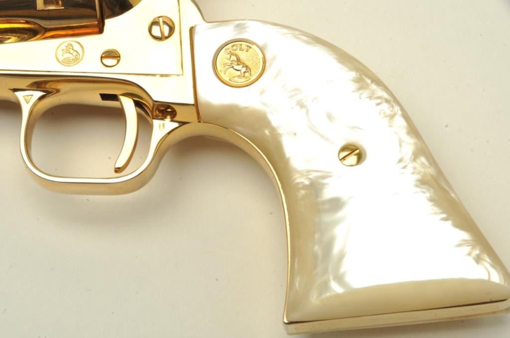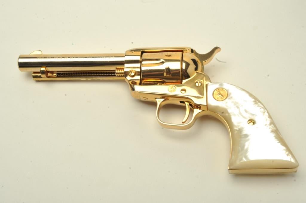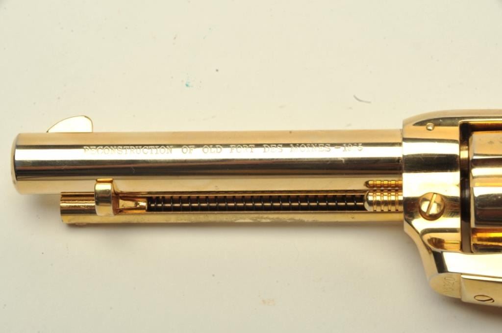 Moines-1965” Commemorative Single Action, .22L.R. caliber, 4 ¾” barrel, Gold finish, Faux pearl medallion grips, S/N 0302DM. This revolver remains in very good plus condition showing little to no use and some handling marks also showing a faint index line on the cylinder. The bore is good and the action is tight. (C&R/PPT) Est.: $250-$500