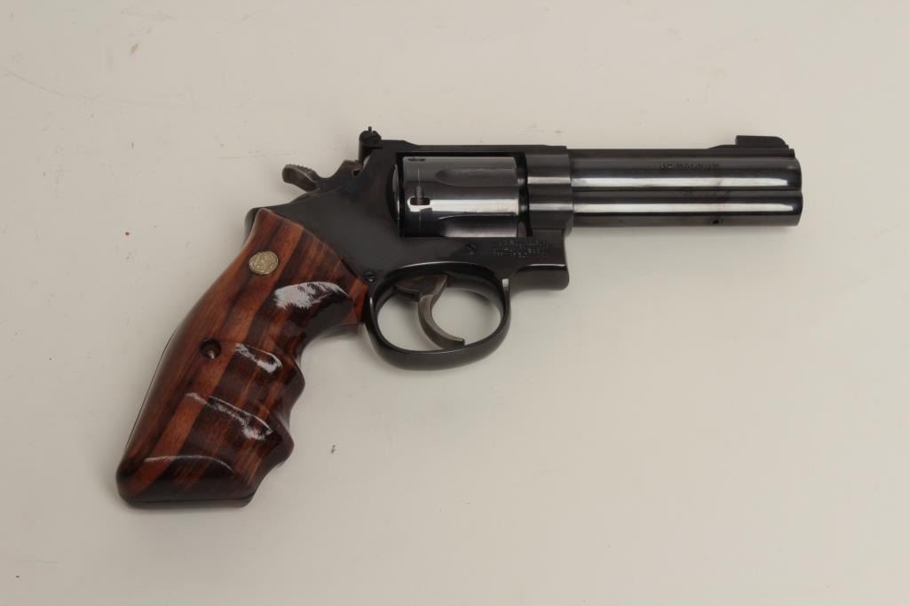 .32 Magnum caliber, 4” barrel, blued finish, finger groove wood medallion grips, S/N BEH1372, in overall excellent condition. (Modern/PPT). Est.: $500-$1,000.