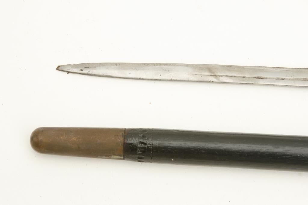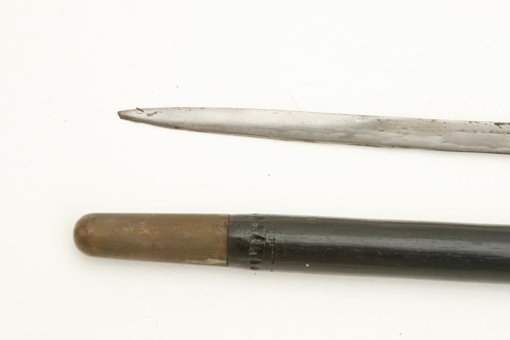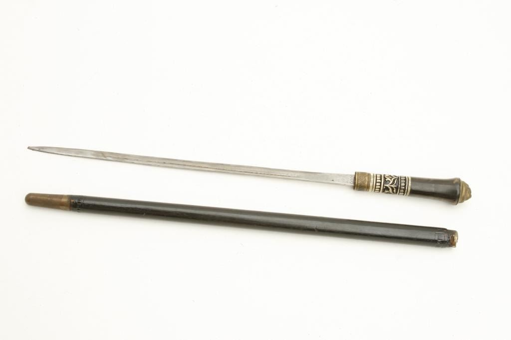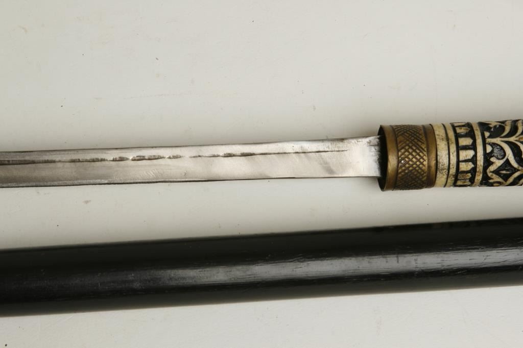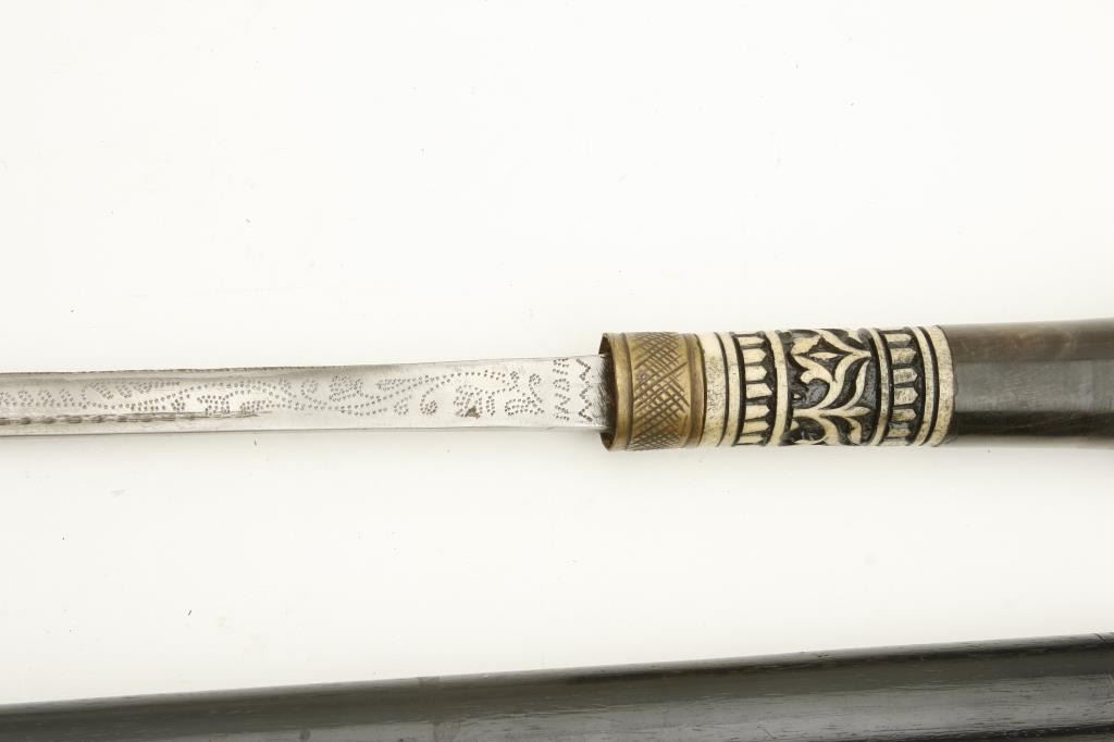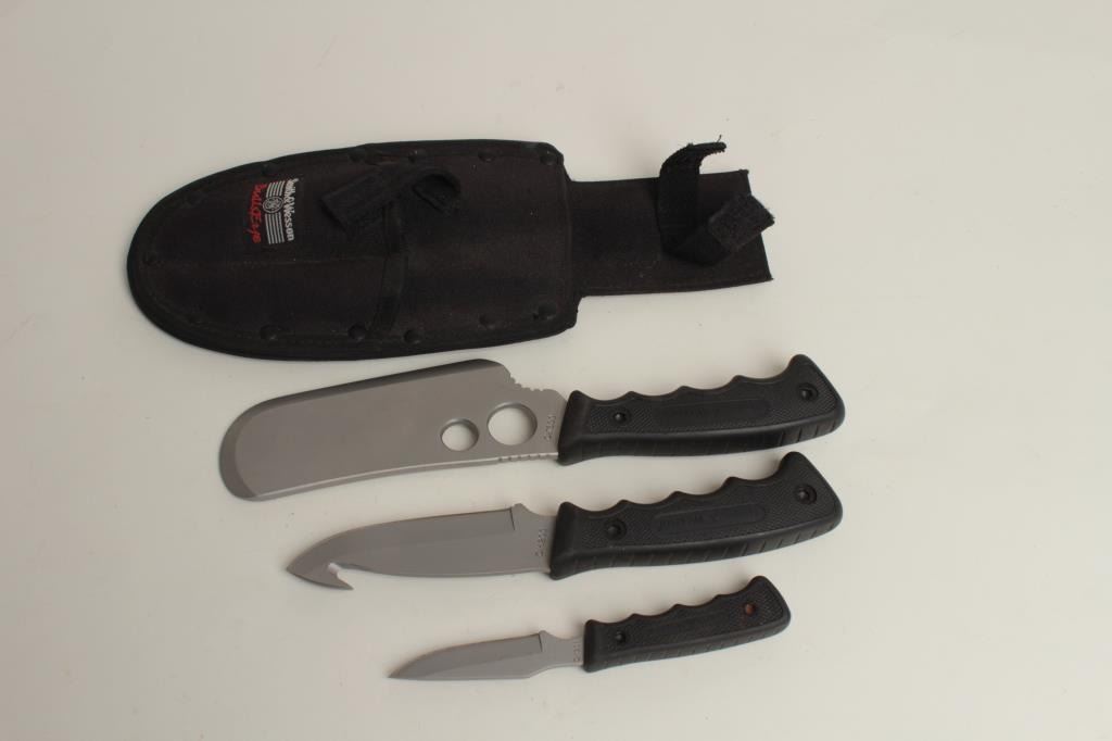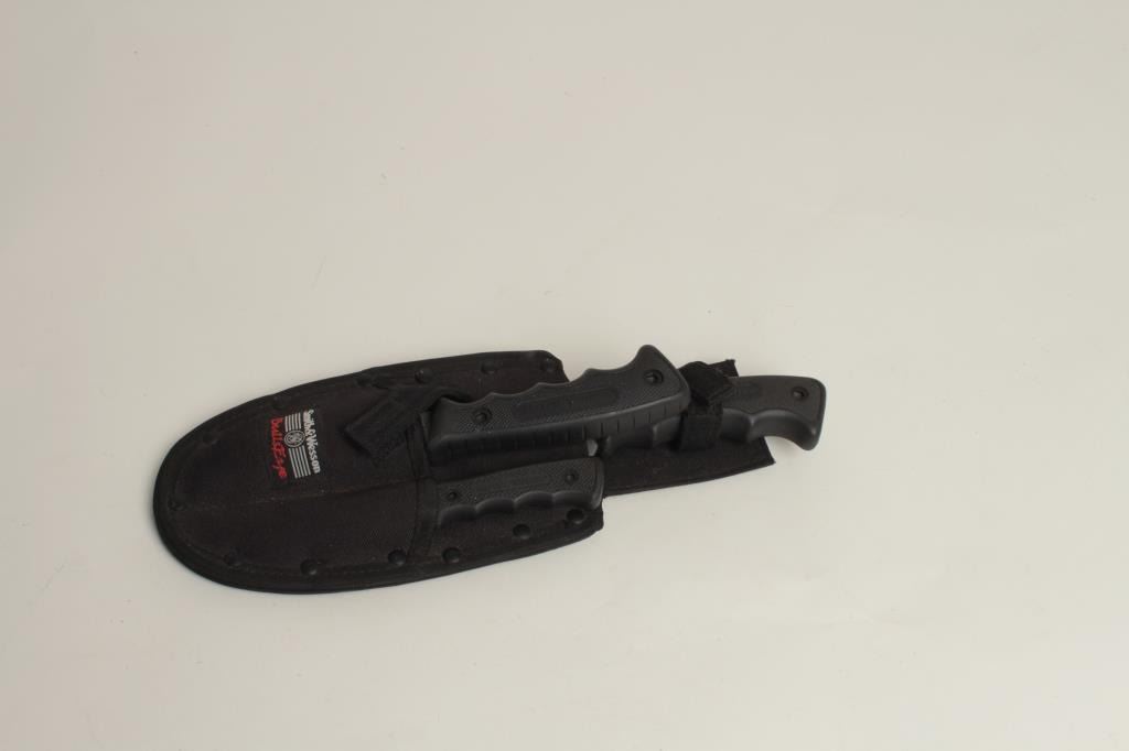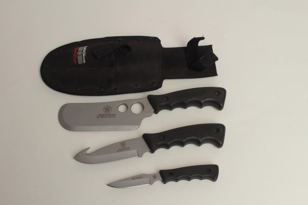 24” overall with horn and carved bone grip plus a set of Smith & Wesson Bulls Eye knives in woven belt holster; knives in very good condition. Est.: $75-$150.
