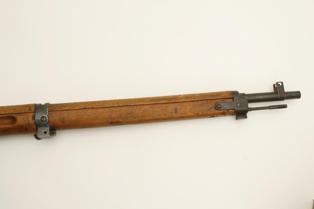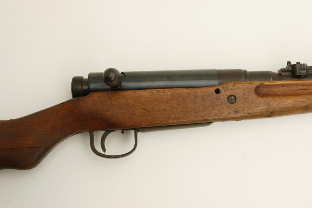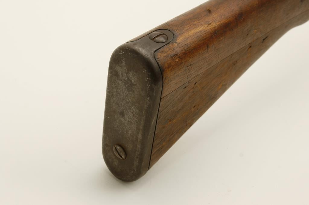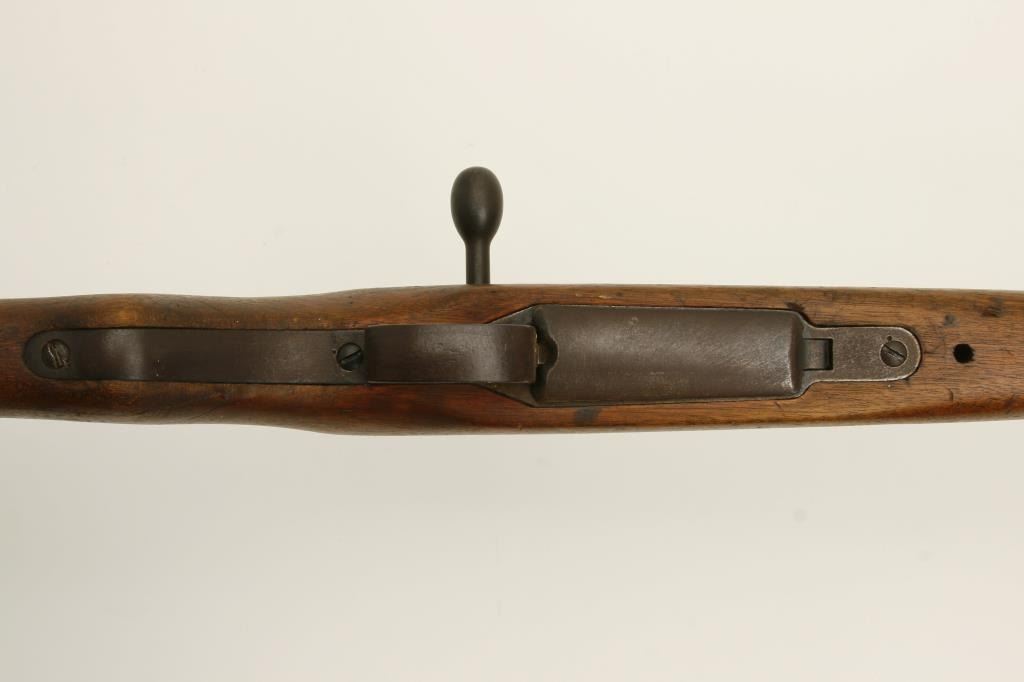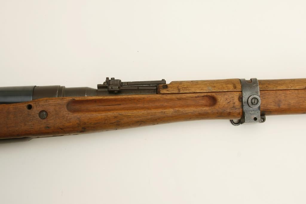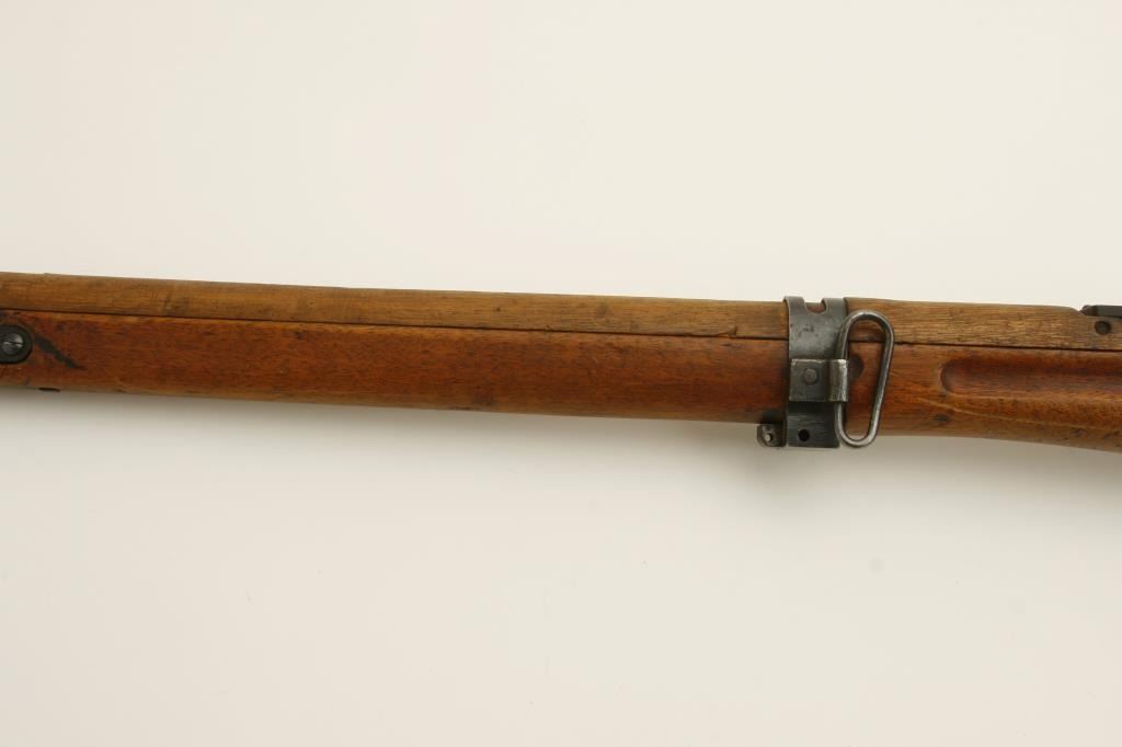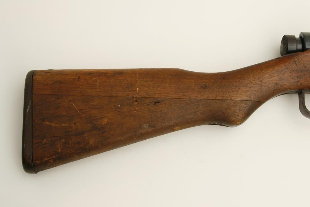 The rifle is in good overall condition with a 26 ½” barrel. The barrel retains a significant amount of its military finish with original front sight and tangent style military rear sight which still includes the aircraft wings. The receiver shows blue in protected areas with the remainder going to a brown patina. The mum is still present on the front ring while the action cover is a later replacement. The smooth wood stock has seen considerable use, with numerous dents and compressions and lateral cracks from the pistol grip to the butt on both sides. The stock retains sling swivels and ends with a smooth steel butt plate. The bore is good, the action crisp and markings are legible. (C+R) Est.: $150-$300.