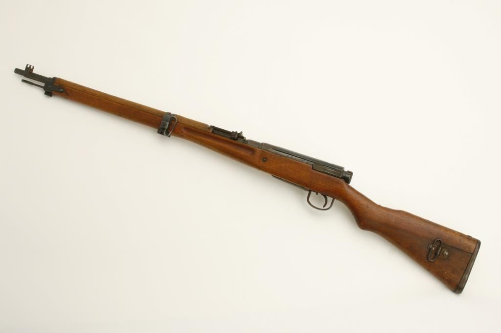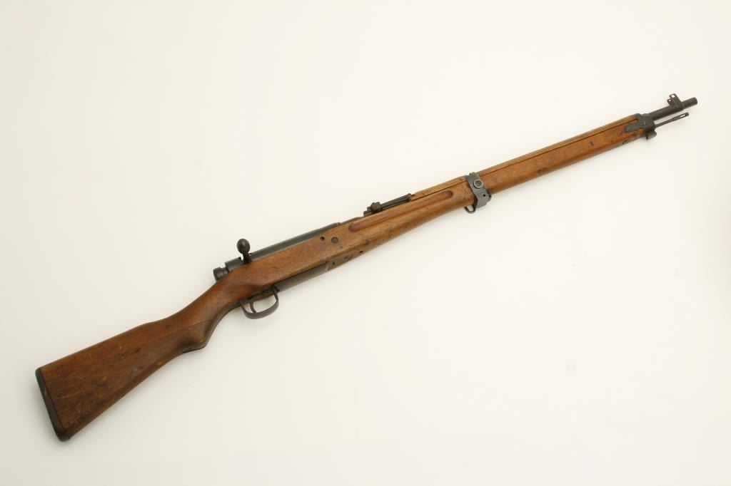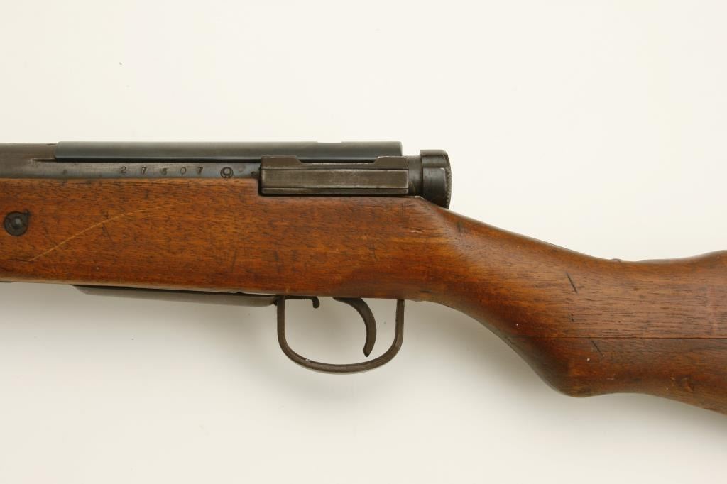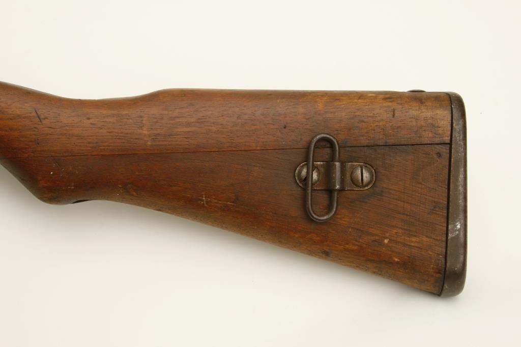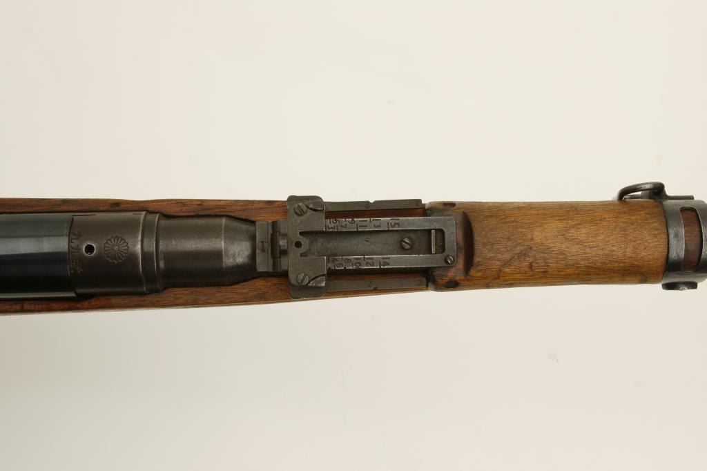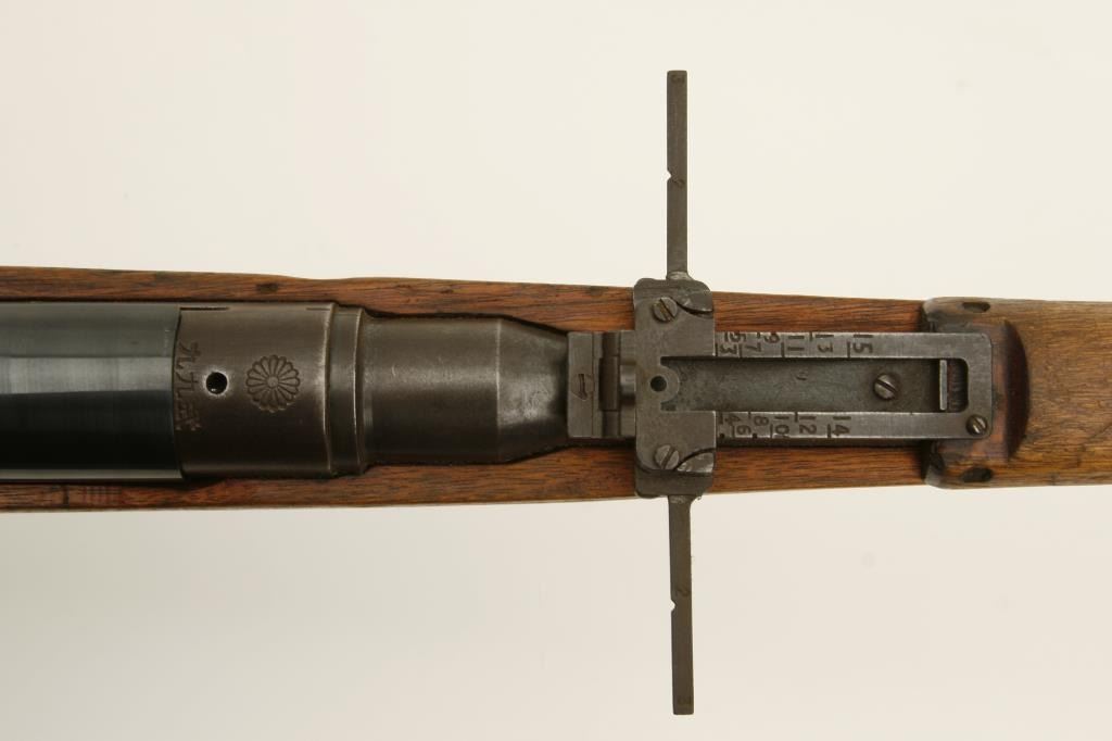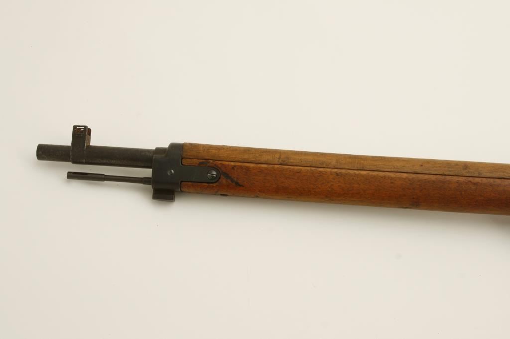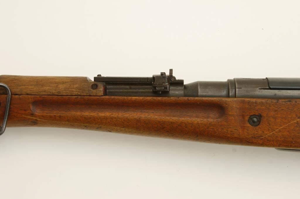 The rifle is in good overall condition with a 26 ½” barrel. The barrel retains a significant amount of its military finish with original front sight and tangent style military rear sight which still includes the aircraft wings. The receiver shows blue in protected areas with the remainder going to a brown patina. The mum is still present on the front ring while the action cover is a later replacement. The smooth wood stock has seen considerable use, with numerous dents and compressions and lateral cracks from the pistol grip to the butt on both sides. The stock retains sling swivels and ends with a smooth steel butt plate. The bore is good, the action crisp and markings are legible. (C+R) Est.: $150-$300.