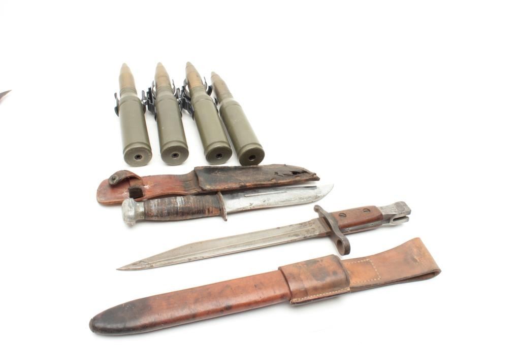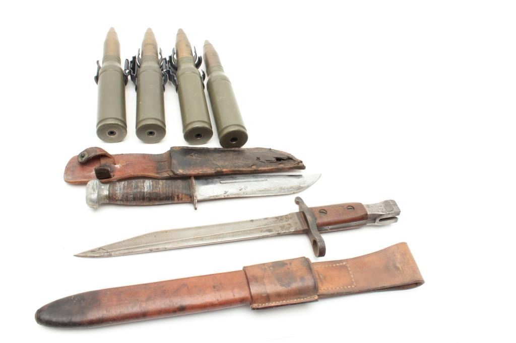 for chain gun on Bradley IFV. 25mm 2. Ross rifle bayonet with scabbard and in very good condition showing broadhead inspections, batch 11 and 12-16 (Date?). Exceptional leather scabbard. 3. Unmarked commando or Navy sheath knife with nickel blade and scabbard. Fair to poor. Est.: $150-$300