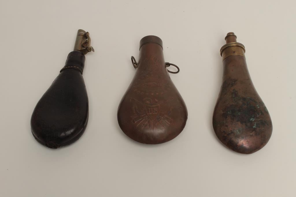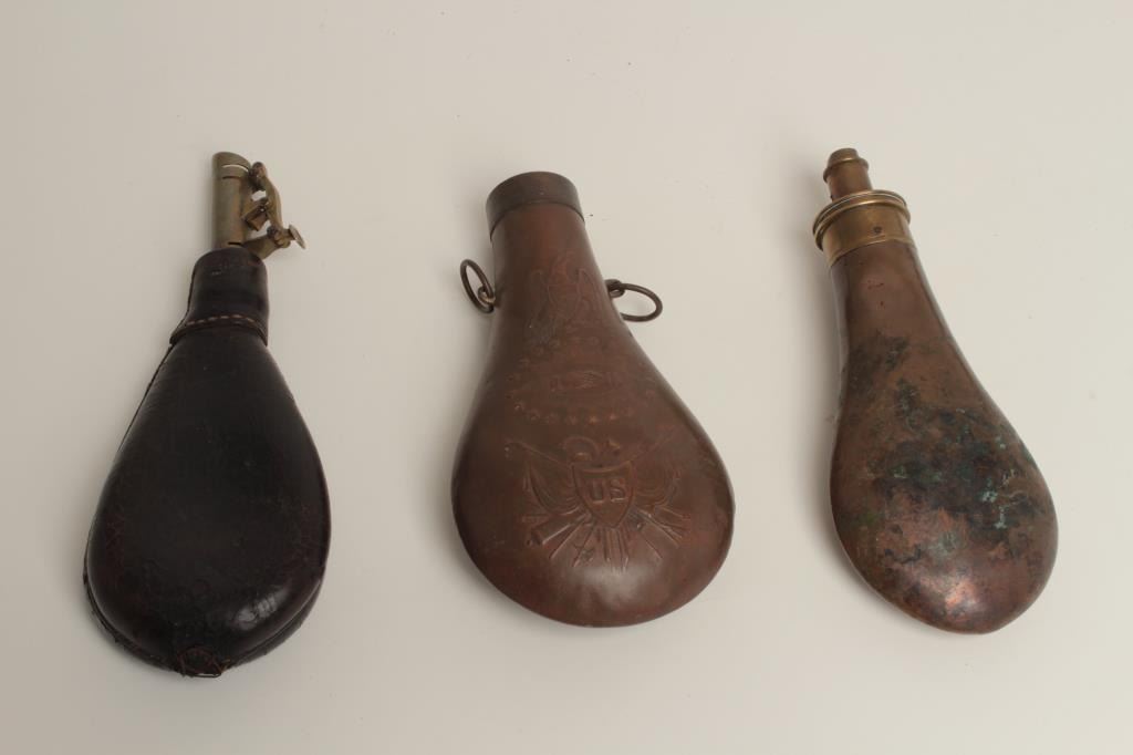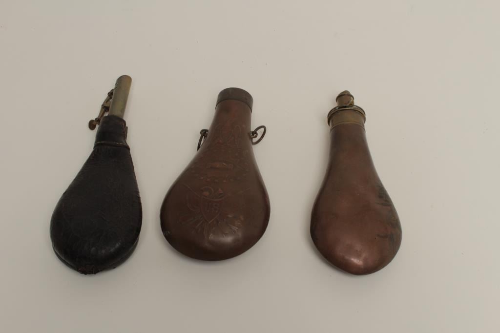 The top is missing. Body and seams good. 2. Shotgun flask marked “Patent” 3 stage charger in drams. The body is undented and the spring is frozen or broken. Fair only. 3. Leather shot flask in fair condition with leather cracking and seams opening. 3 pieces. Est.: $100-$200