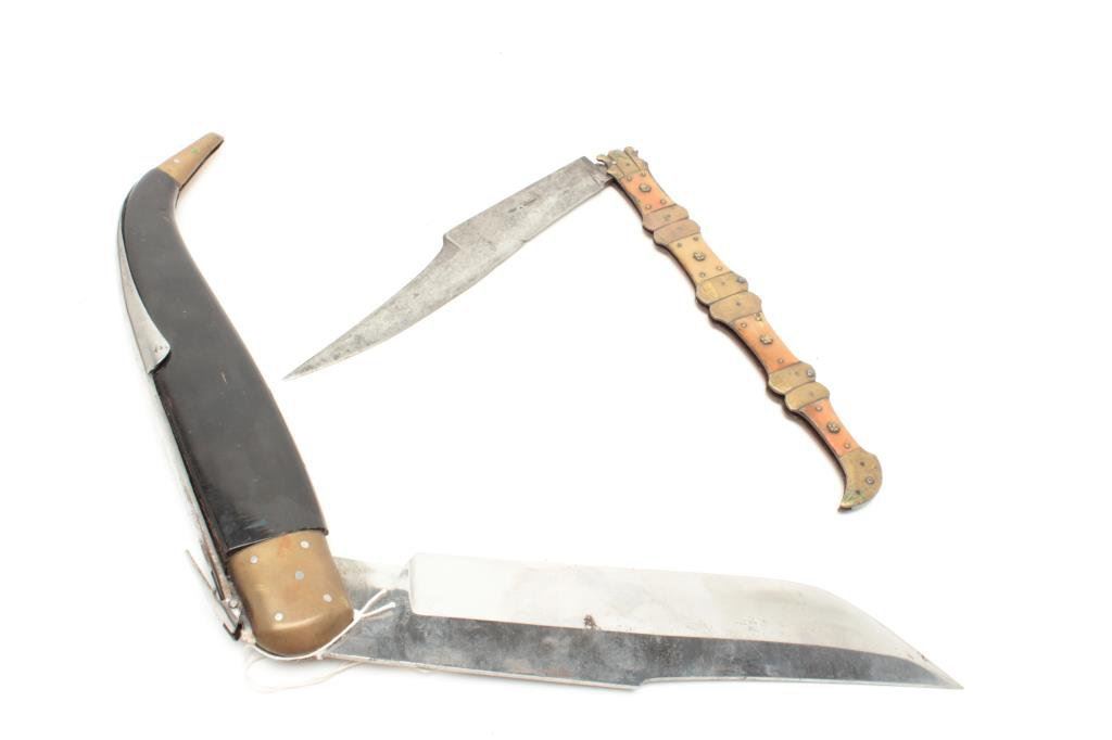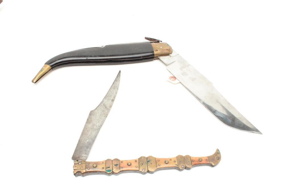 knife from Basque provenances. Measures 17 ½” overall with a 8 ¼” marked blade circa 19th century or earlier. 2. Antique Navaja folding knife from Basque provenances marked “Abacete, Espana”. Measures 20 ½” overall with a 9 ¾” blade and 1 7/8” at widest part with horn grip. Near fine. 20th century. Est.: $200-$400