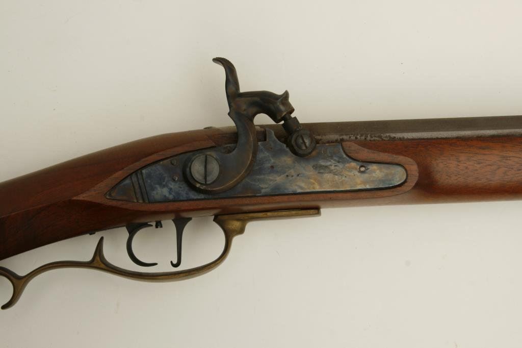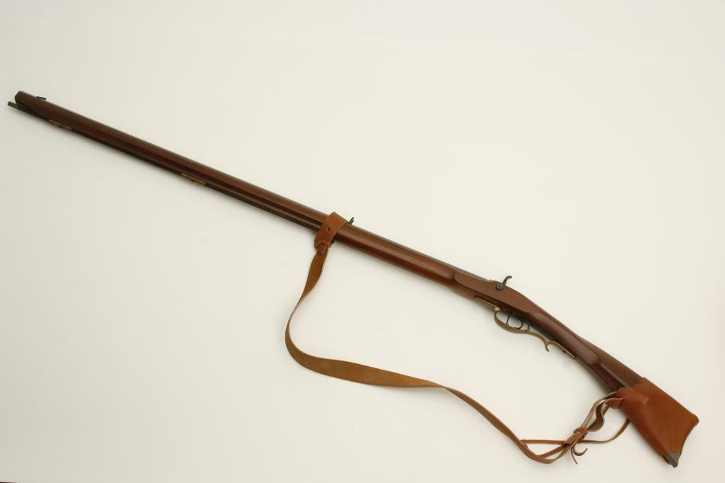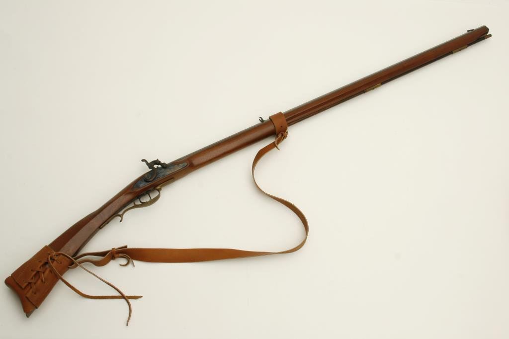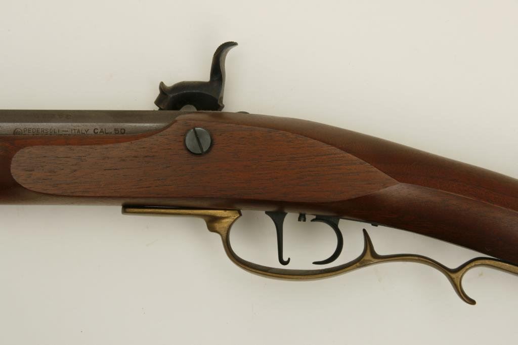by Pedersoli, .50 caliber, 38” octagon barrel, brown and case hardened finish, double set triggers (working at time of description), leather sling and butt stock wrap; overall very good + condition. (Percussion). Est.: $100-$200.