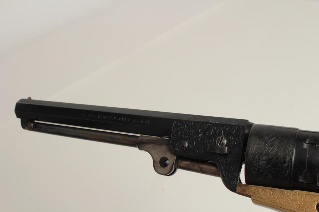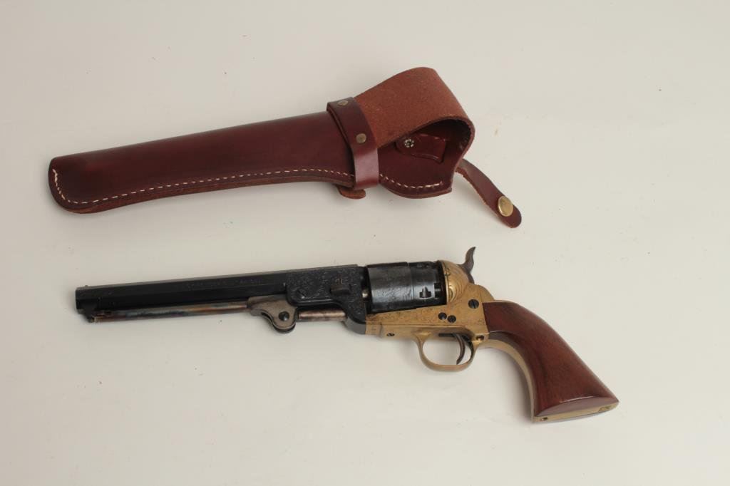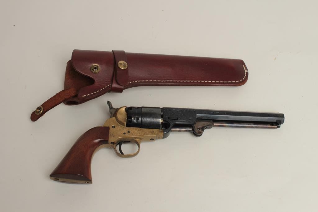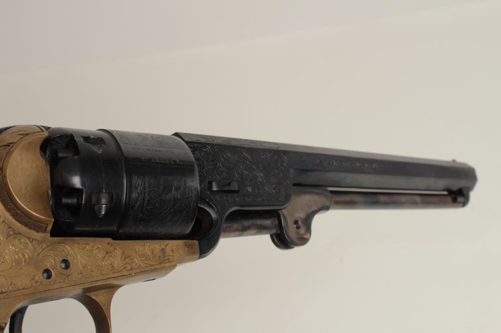 octagon barrel, blued and case hardened finish with brass frame and engraving, wood grips, S/N 341670, in excellent condition showing little if any use; accompanied by a brown leather holster. (Percussion). Est.: $150-$300.