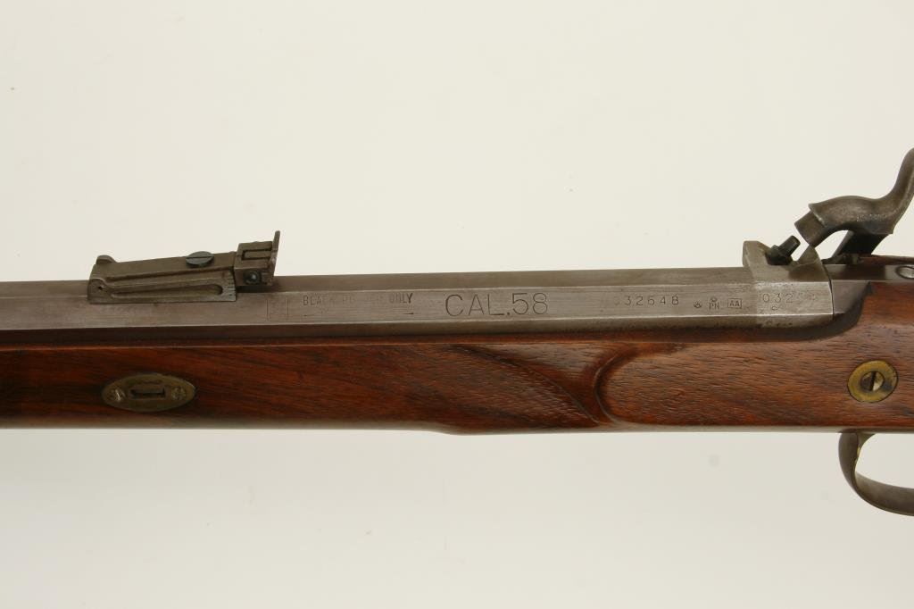 caliber, serial #032648. The rifle is in very good overall condition with a 28” octagonal barrel, adjustable rear and knife blade front sights. The barrel has a brown patina finish while the action side plate retains significant case color. The percussion rifle is marked black powder only on the barrel. The smooth wood stock is in very good condition with a brass patch box inlet into the right side and a full length wooden ramrod and smooth, crescent brass butt plate. A really nice reproduction Hawken rifle. Est.: $100-$200.