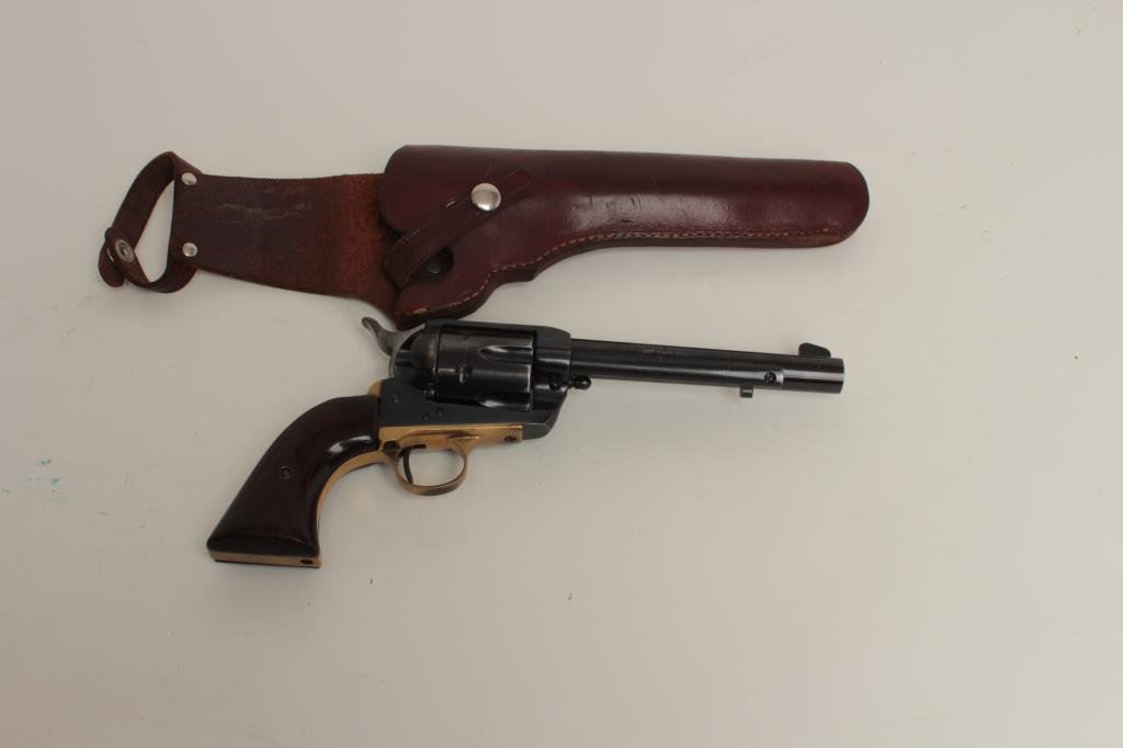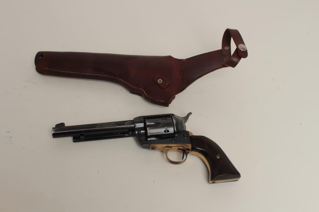 revolver by Sauer, Western Marshal Model, .357 Magnum caliber, 6” barrel, blued finish, wood grips, S/N 3/21358, in overall very good condition with a fine bore, crisp action, strong markings and very good wood grips. Accompanied by a brown leather holster. (Modern/PPT). Est.: $100-$200.