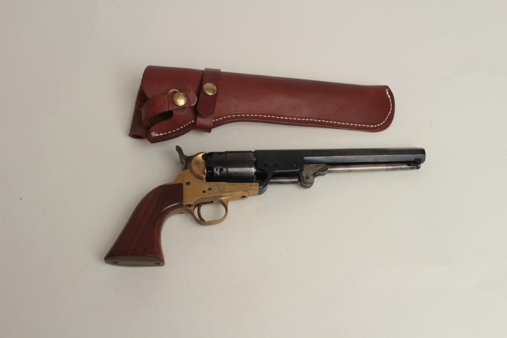 caliber, brass frame, blued and case hardened finish, wood grips, S/N 355161, in near new condition and with a brown leather holster. (Percussion). Est.: $100-$200.