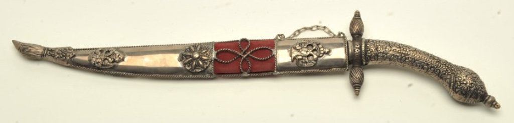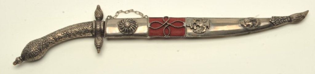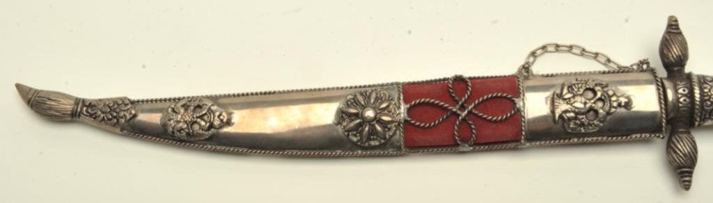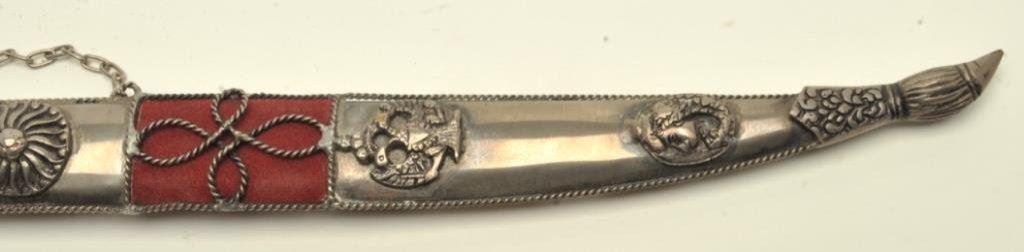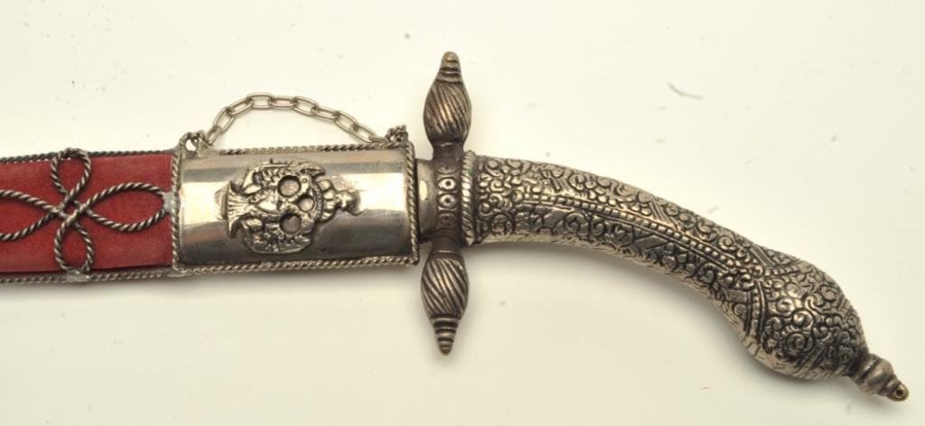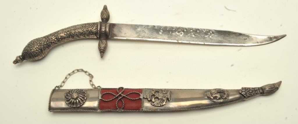 and fancy mounted sheath; silver and alloy metal, approximately 17” overall. Est.: $100-$200.