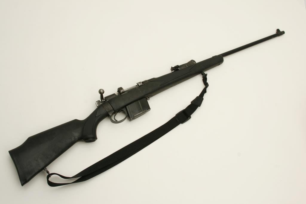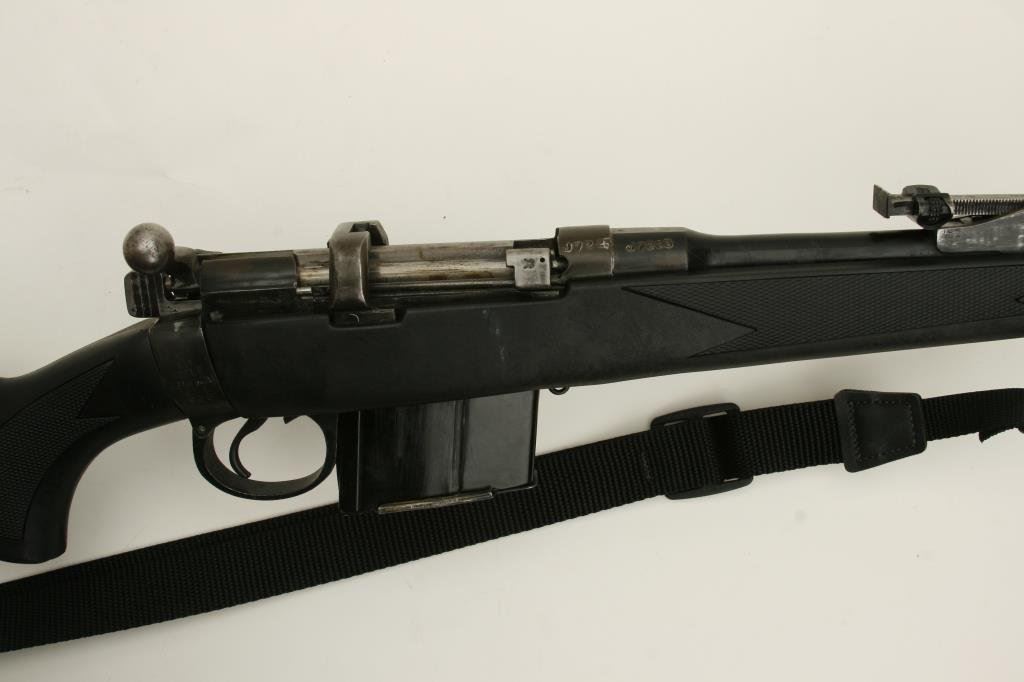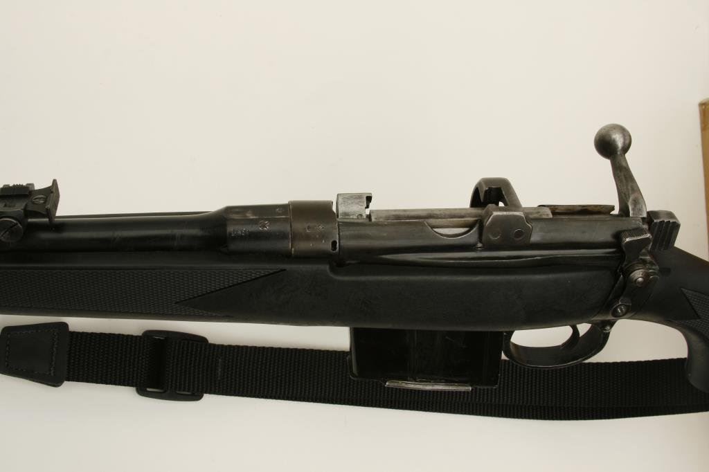 serial #J7225. The rifle is in fair overall condition with a 25” military barrel. The barrel retains the original military sights. The barrel and action show significant wear but retain small amounts of the military finish. The action is not working at the time of description and should be checked by a competent gunsmith before using this rifle. The receiver is import marked and dated 1966. The bore is good and markings are legible. The black, synthetic sporter stock is in good condition showing moderate use and wear. The rifle is equipped with sling swivels and a nylon sling. (Modern) Est.: $125-$250.