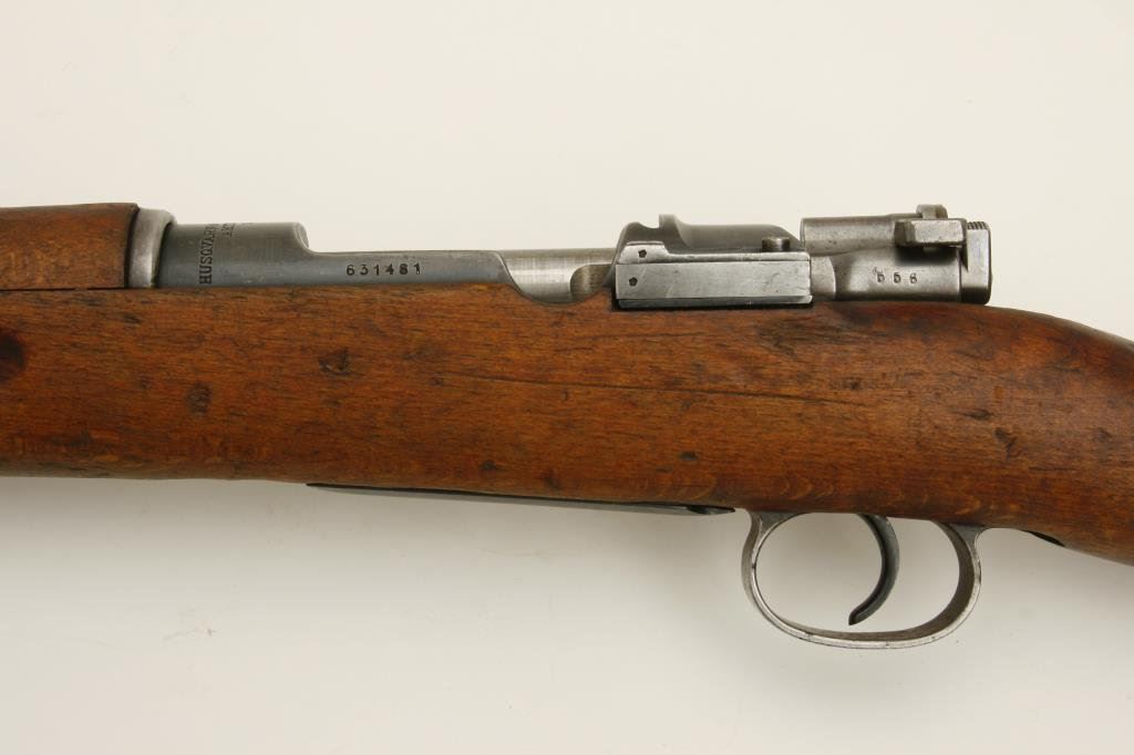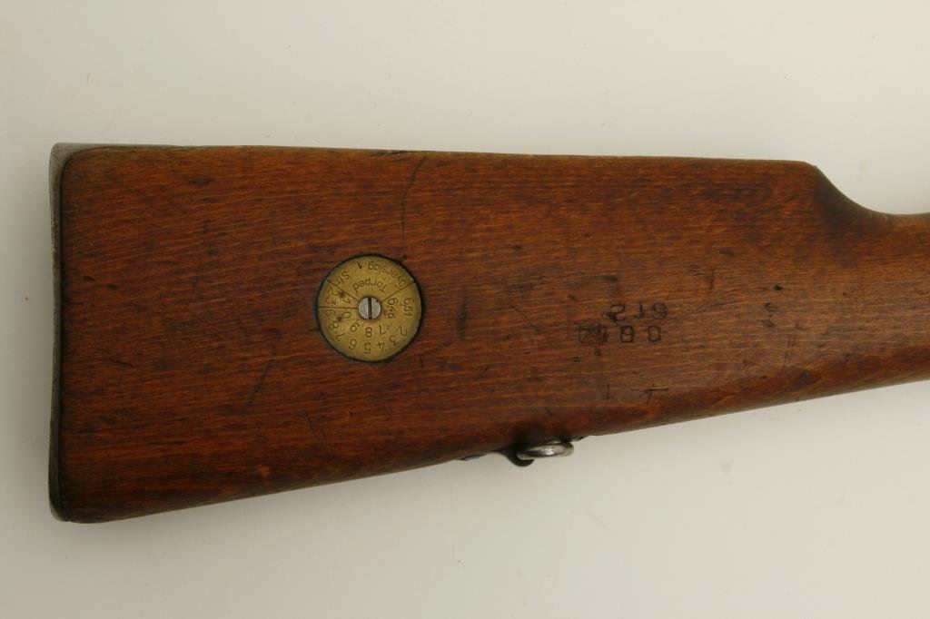 x 55 caliber, serial #631481. The rifle is good overall condition with a 26” import marked barrel, having had a 2” muzzle break added. The barrel and receiver retain a significant amount of their thinning blue finish. The Husqvarna manufactured action is marked 1942. The smooth wood stock shows significant wear with numerous mars, dents and compressions. The butt stock ends with a smooth, steel butt plate and has the brass disk still inlayed into the stock. The bore is good, the action crisp and markings are sharp on this nice Swede. (C+R) Est.: $150-$300.