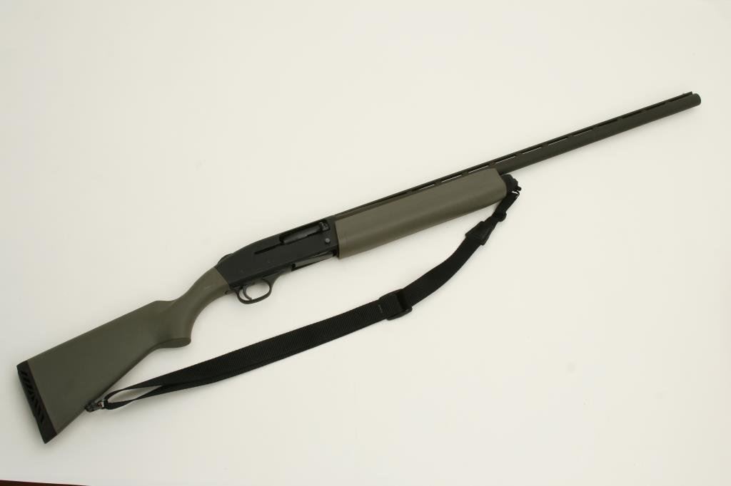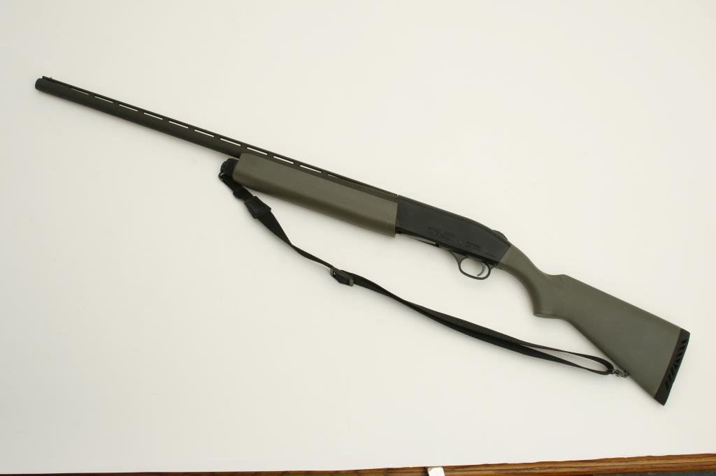 #SF7058. The shotgun is in nearly excellent condition showing little use. The shotgun has a 28” barrel with a full-length ventilated rib and ivory bead style front sight. The barrel and action retain nearly all of their blued finish with only light handling marks noted. The OD green synthetic stocks are in nearly excellent condition with only storage marks. The butt stock ends with a ventilated rubber pad providing a 14” LOP. The bore is excellent, the action crisp and markings are sharp on this lightly used shotgun. The lot includes a black, nylon sling. (Modern) Est.: $175-$350.