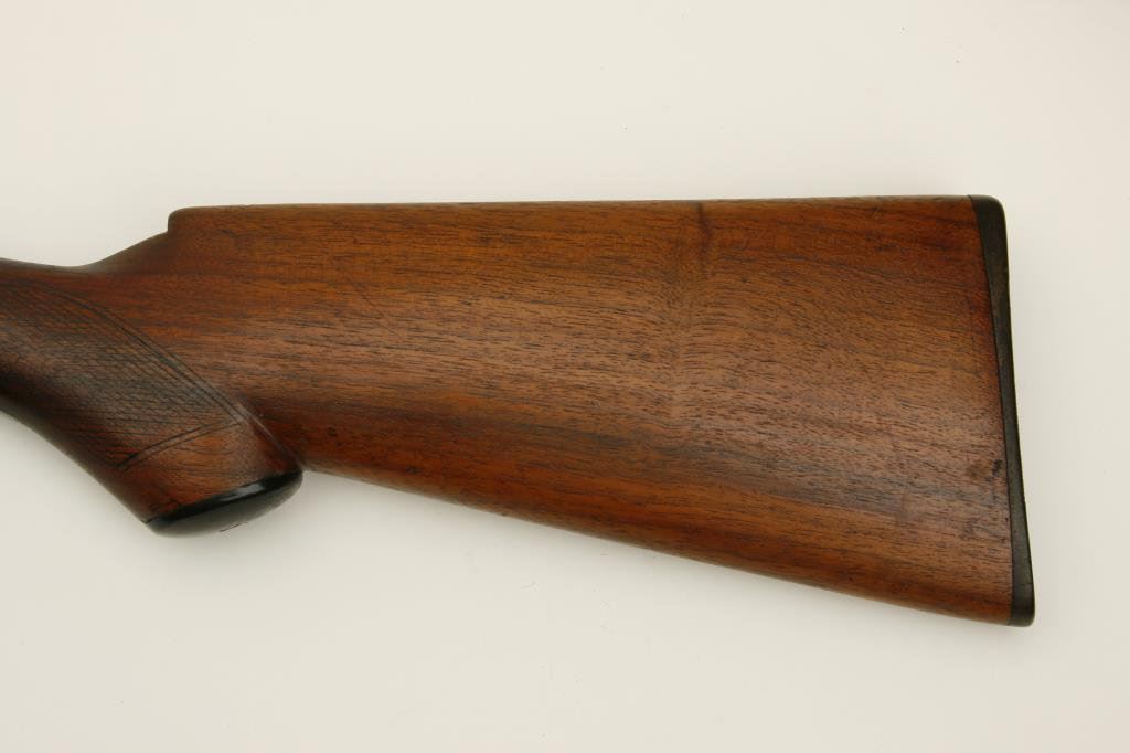 gauge, serial #431242. The shotgun is in very good overall condition with 32” barrels, full-length filed rib and steel bead front sight. The barrels retain the majority of their blued finish while the receiver sows a significant amount of muted case color. The shotgun features dual triggers and the barrels are marked smokeless powder steel. The checkered wood stocks are in good condition with small mars and flattened checkering. The stocks have an old coat of varnish added during the period of use. The butt stock ends with a hard rubber butt plate and a 14” LOP to the front trigger. The bores are good, the action crisp and markings are sharp. (Modern) Est.: $250-$500.