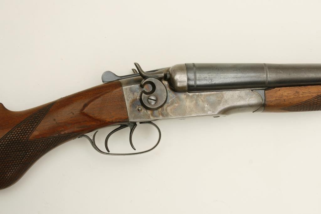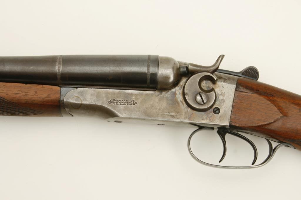serial #25012. The shotgun is in good overall condition with 30” barrels with a full-length filed rib and steel bead front sight. The barrels retain approximately 60% of their thinning blue finish with light surface erosion noted. The receiver features significant muted case color. The checkered wood stocks are in good condition showing use and small mars, with a splinter fore end. The butt stock features a Prince of Wales pistol grip, plastic Stevens marked butt plate and 14 ½” LOP to the front trigger. The bores are good, the action crisp and markings are legible. (C+R) Est.: $300-$600.