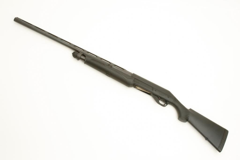 The shotgun is in very good condition with a 27” barrel featuring a full-length ventilated rib. The barrel has some light surface rust from poor storage and is missing the front sight. The barrel and action retain the majority of their blued finish. The black synthetic stocks are in very good condition, showing little use. The butt stock ends with a rubber recoil pad providing a 14 ¼” LOP. The bore is very good, the action crisp and markings sharp. (Modern) Est.: $300-$600.