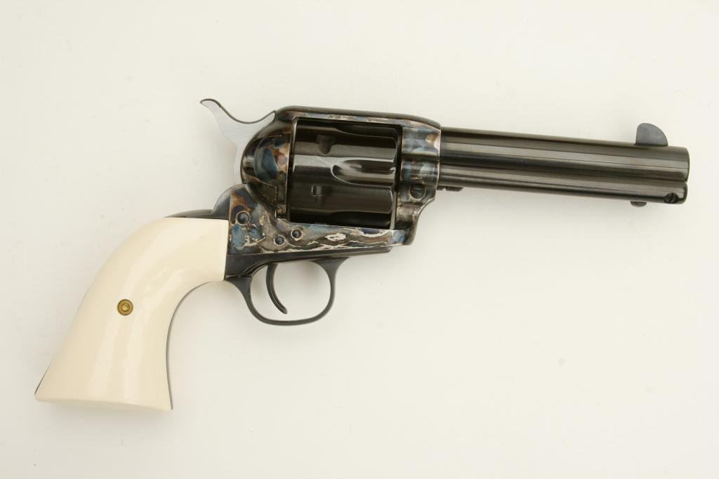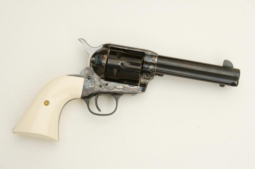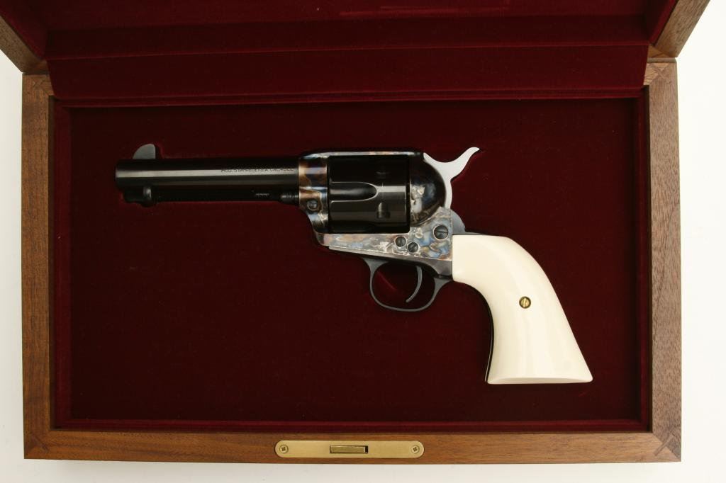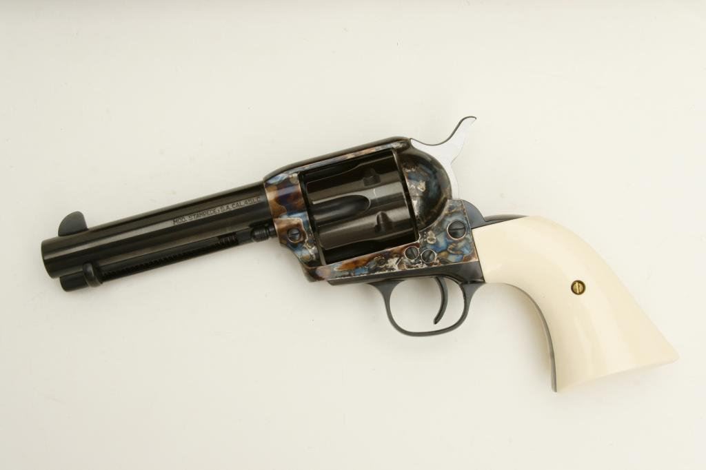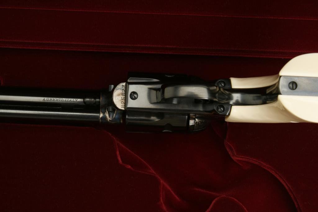 Action revolver, .45LC caliber, 4.75” barrel, blued finish, simulated ivory grips, S/N B25623, blued and case hardened finish, in near new condition accompanied by factory cardboard box with end label numbered to this gun. (C&R/PPT). Est.: $400-$800.