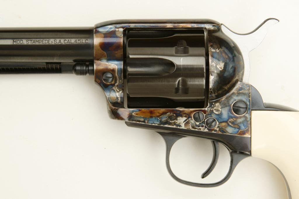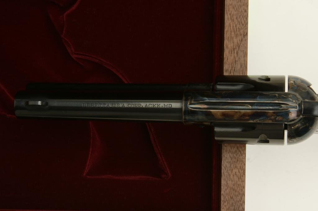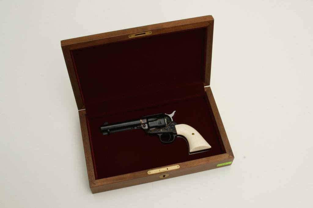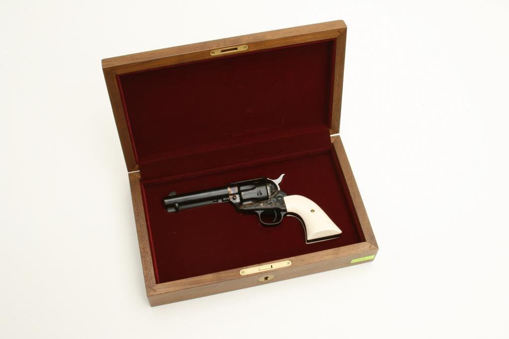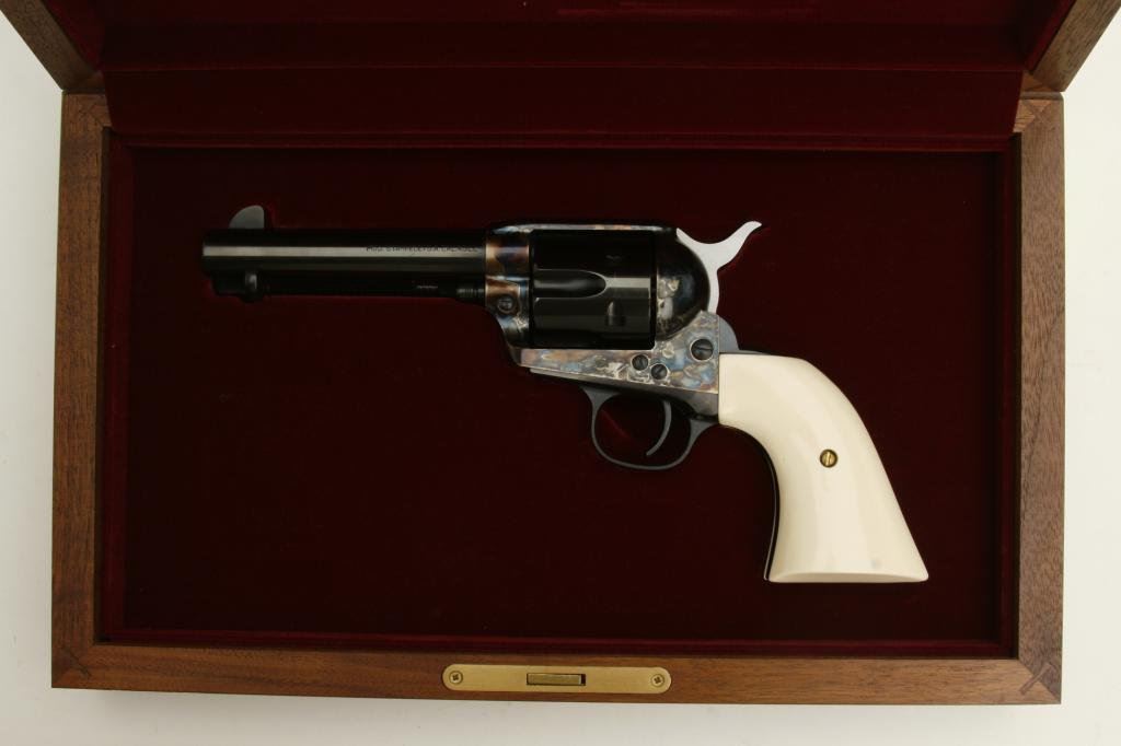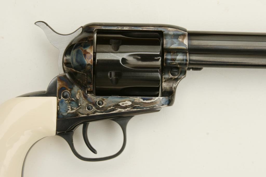 Action revolver, .45LC caliber, 4.75” barrel, blued finish, simulated ivory grips, S/N B25623, blued and case hardened finish, in near new condition accompanied by factory cardboard box with end label numbered to this gun. (C&R/PPT). Est.: $400-$800.