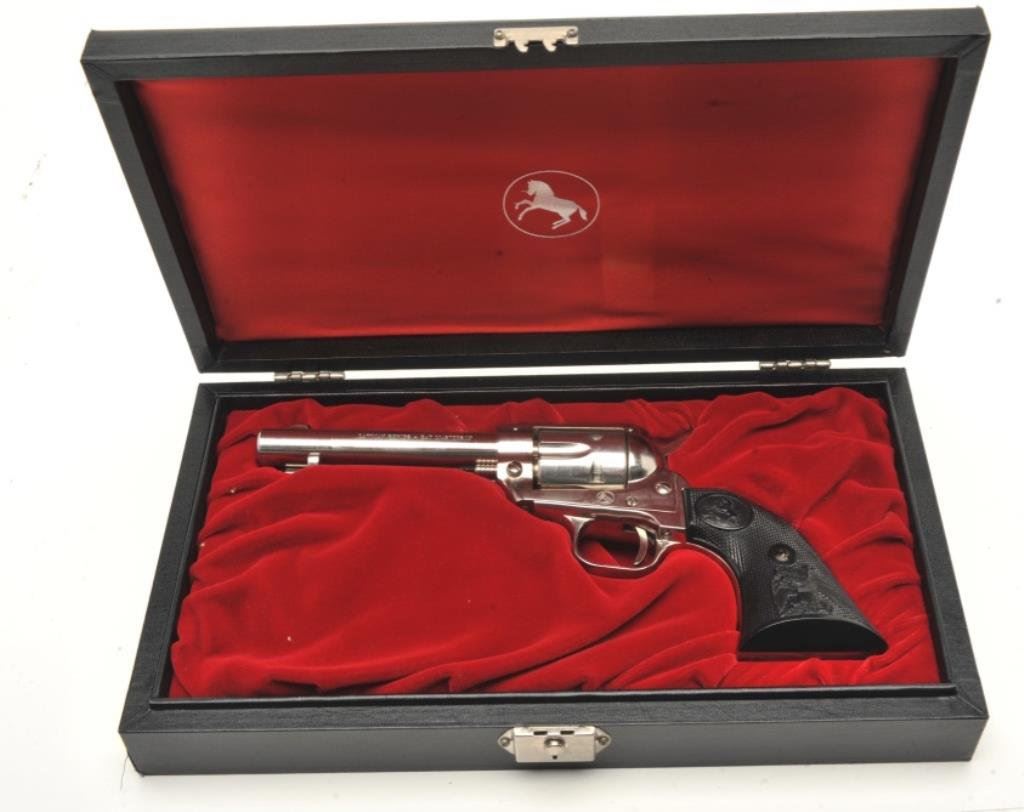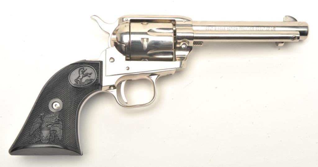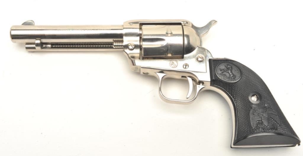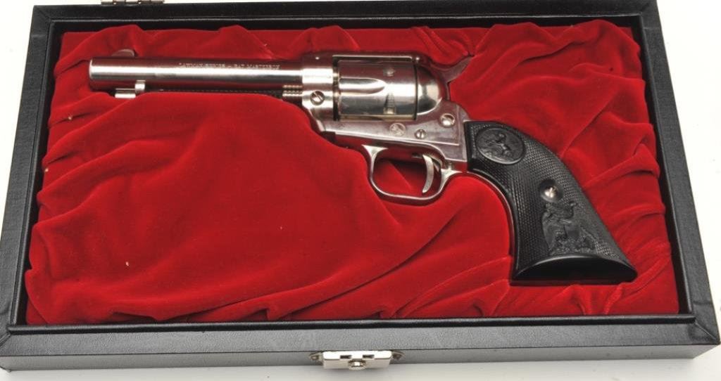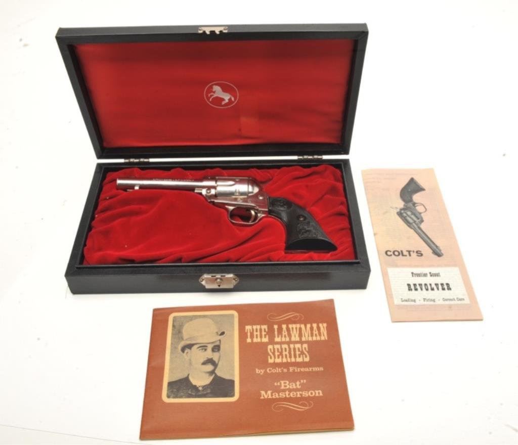 Bat Masterson SAA revolver, .22LR caliber, 4.75” barrel, nickel finish, checkered black eagle grips, S/N 361LM, in near new condition with instructions and commemorative paperwork. (C&R/PPT). Est.: $500-$1,000.