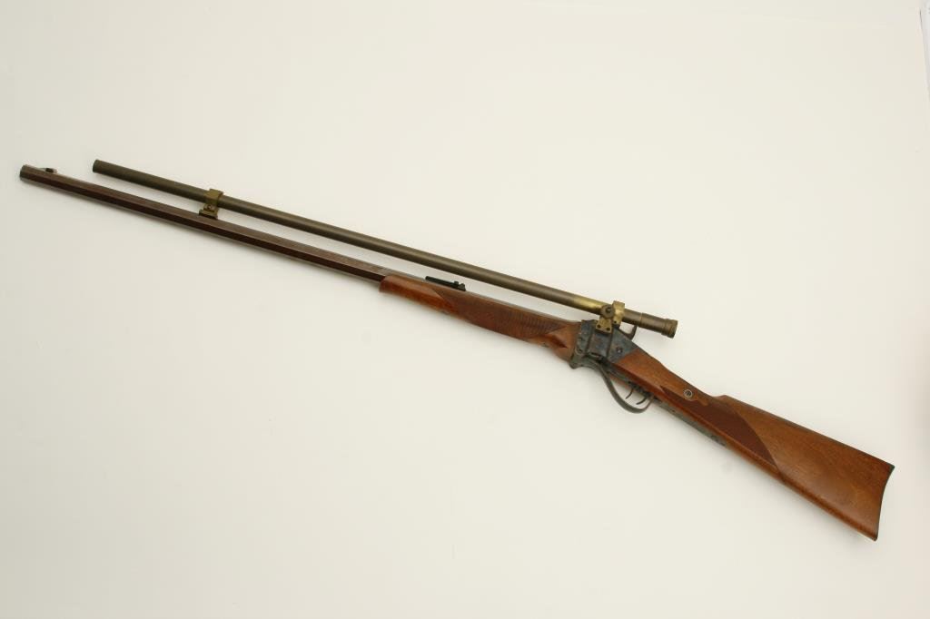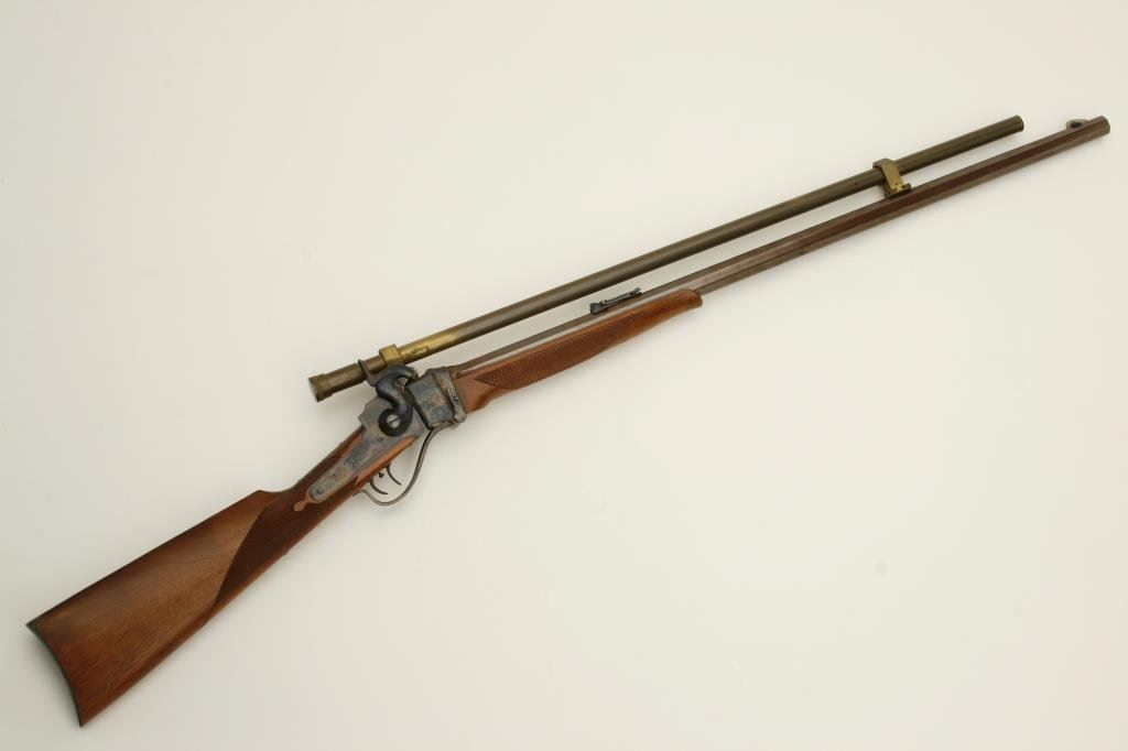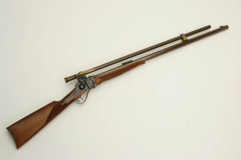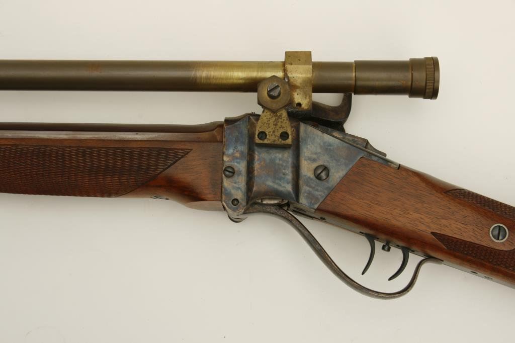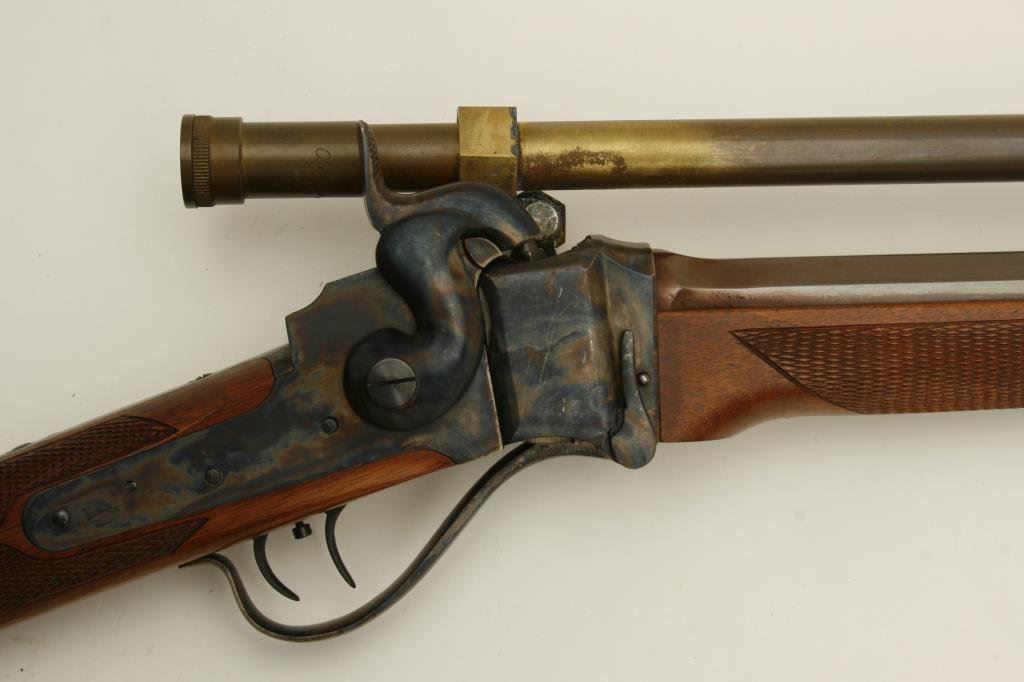 serial #SH2873. The rifle is in nearly excellent condition with a 32” octagon barrel, featuring a knife blade front sight and elevator rear. The barrel is browned, retaining nearly all of its finish. The receiver shows vivid case color, as do the lever, tang and steel butt plate. The finely checkered wood stocks are in very good condition with only slight storage marks evident. The rifle is topped with a 32 ½” Cabelas long range brass scope. The bore is very good, the action crisp and markings are sharp on this Italian reproduction of a classic Sharps rifle. (Modern) Est.: $500-1,000