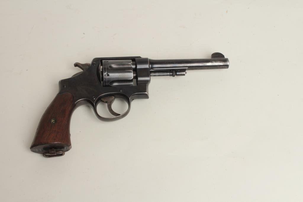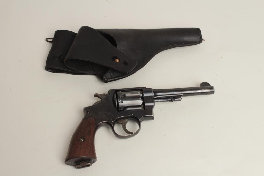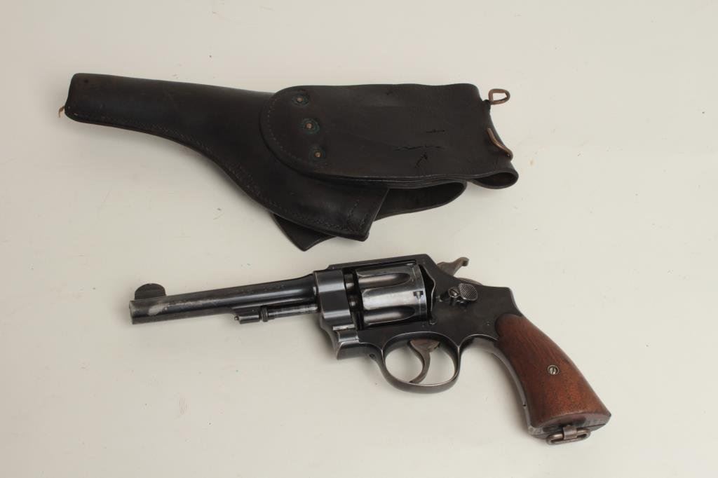 DA revolver, .45 caliber, 5.5” barrel, blued finish, wood grips, lanyard ring, S/N 55476, in overall very good condition showing the majority of its original blue finish with high point and muzzle wear; crisp action, sharp markings, near fine bore and grips. Accompanied by an interestingly modified U.S. leather flap holster that may have originally been for an Artillery Model Single Action revolver (?). (C&R/PPT). Est.: $500-$1,000.